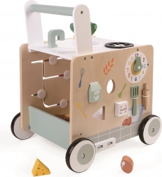 Dank des robusten Holzrahmens ist der Lauflernwagen stabil und widerstandsfähig, die gummierten Räder gewährleisten eine leise und sichere Fortbewegung auf dem Boden. Auf allen vier Seiten warten viele Aktivitäten: Formeinwurf (Lebensmittel), drehbare Zahnräder, Gemüse-Labyrinth, Spüle mit Armatur, Kochplatte und ein transparenter Ofen. Der Lauflernwagen ist ein ideales Geschenk für Kleinkinder ab 12 Monaten.
