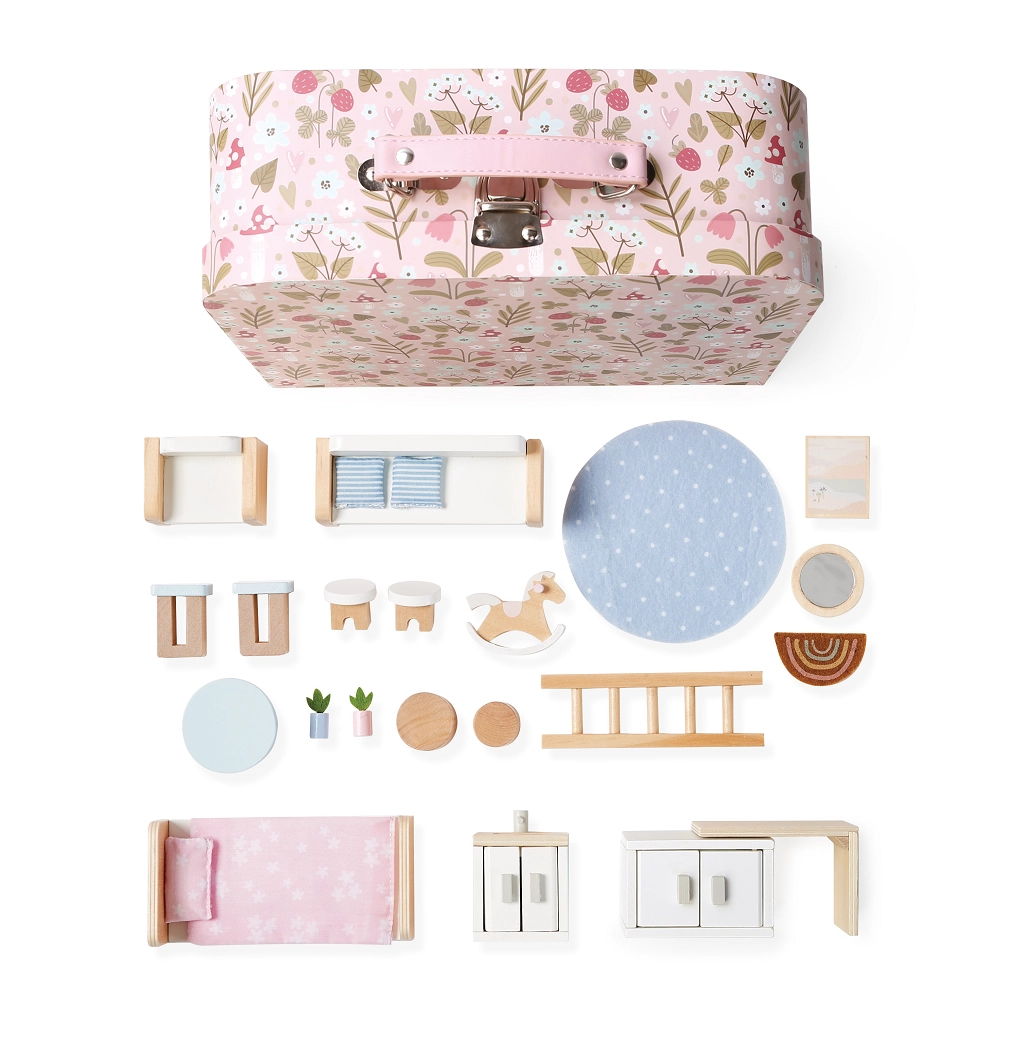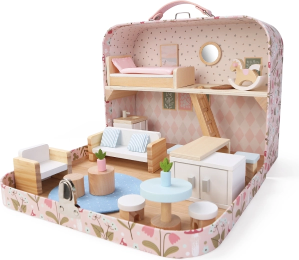 Dieses stilvolle Puppenhaus im praktischen Koffer bietet alles, was kleine Puppen für ein komfortables Leben brauchen. Nach dem Öffnen entsteht ein kompletter Wohnbereich mit durchdachten Details, die Kinder begeistern und ins Spiel hineinziehen. Dank der kompakten Maße lässt es sich problemlos auf Ausflüge, zu den Großeltern oder in den Urlaub mitnehmen.
