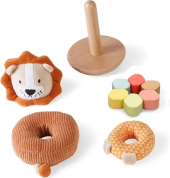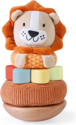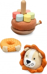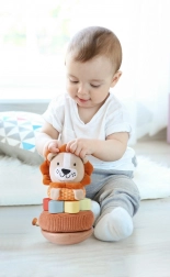 Die Steckringe Löwenbaby kombinieren glatte Holzelemente mit weichen Textilien und angenehmem Plüsch. Kinder stapeln vom größten zum kleinsten Teil und trainieren Geduld und Logik. Der letzte Schritt ist das witzige plüschige Löwenköpfchen, das den ganzen Turm vervollständigt.