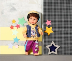 Gönnen Sie Ihrer Puppe einen modernen Streetwear-Look. Das Set enthält einen gelben 2-in-1-Kapuzenpullover mit aufgenähter Weste im Jeans-Look und eine bequeme Jogginghose in auffälliger Brombeerfarbe. Lustige Tierprints und Sterne verleihen dem Outfit eine verspielte Note und regen zu kreativen Geschichten und langen Spielzeiten an.