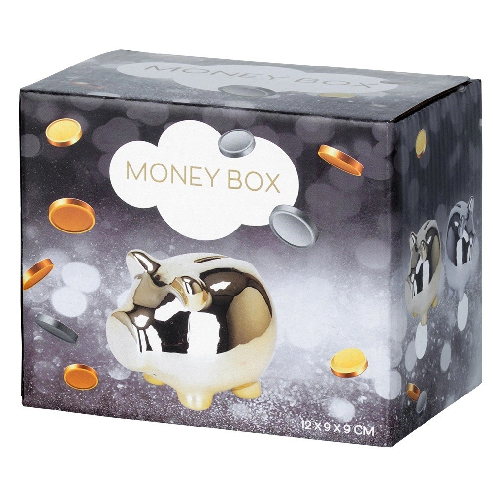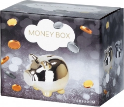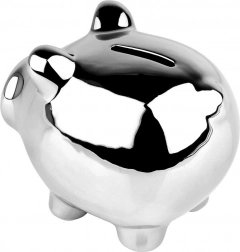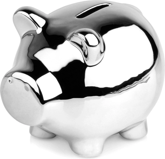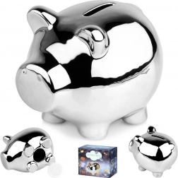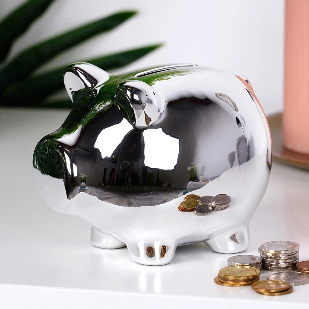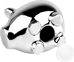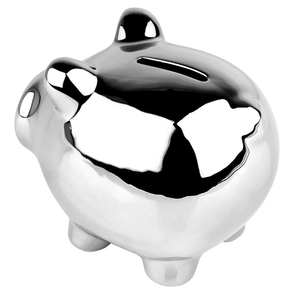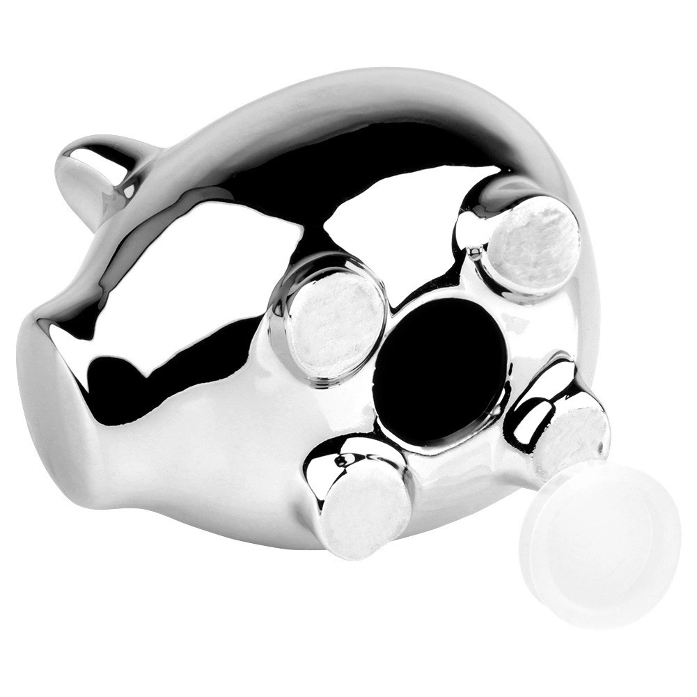 Die stilvolle silberne Spardose in Schweinchenform ist ideal zum Aufbewahren von Münzen und Banknoten. Das glänzende Spiegel-Finish verleiht jedem Interieur eine moderne Note und fügt sich perfekt in einen eleganten Glamour-Stil ein. Die Öffnung an der Unterseite mit Verschluss ermöglicht ein komfortables Entnehmen der Ersparnisse, ohne die Spardose zerschlagen zu müssen.