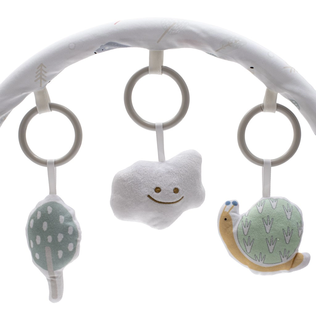Der abnehmbare Spielbügel mit drei weichen Spielzeugen fördert die Koordination und die Sinnesentwicklung. Lässt sich zum Füttern oder Schlafen leicht abnehmen.