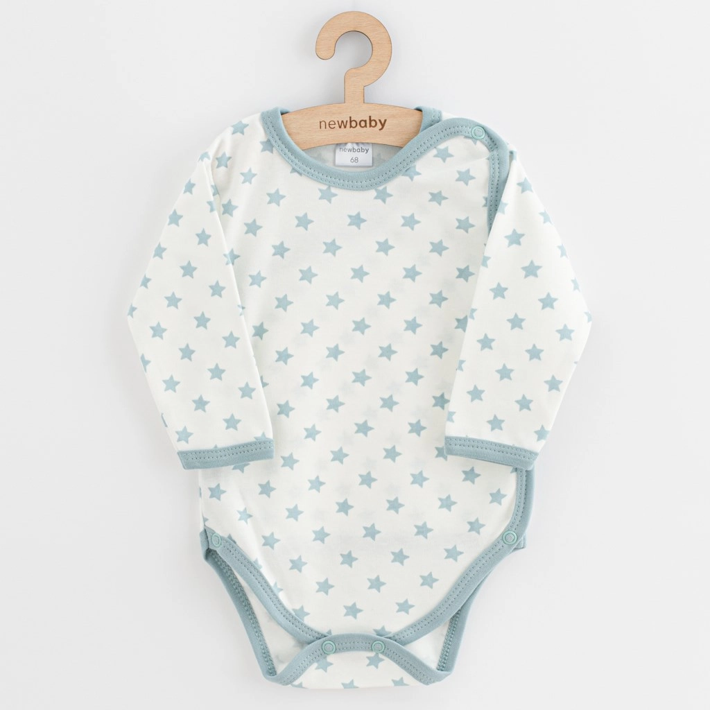 Praktisches Set aus drei Baby-Bodys NEW BABY Classic II Uni, das mit Komfort und Qualität überzeugt. Die Bodys sind vollständig mit Druckknöpfen zu öffnen für einfaches An- und Ausziehen sowie Wickeln, aus 100 % weicher Baumwolle gefertigt, und im Set finden Sie 3 Designs – mint, mit Dinosauriern und mit Sternchen.