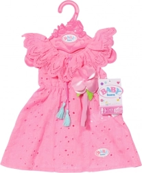 Das Kleid in Rosaton mit gerafftem Kragen, dekorativen Bändchen und Quasten verleiht jeder BABY born Puppe einen zarten Look.