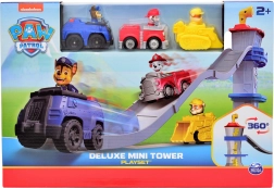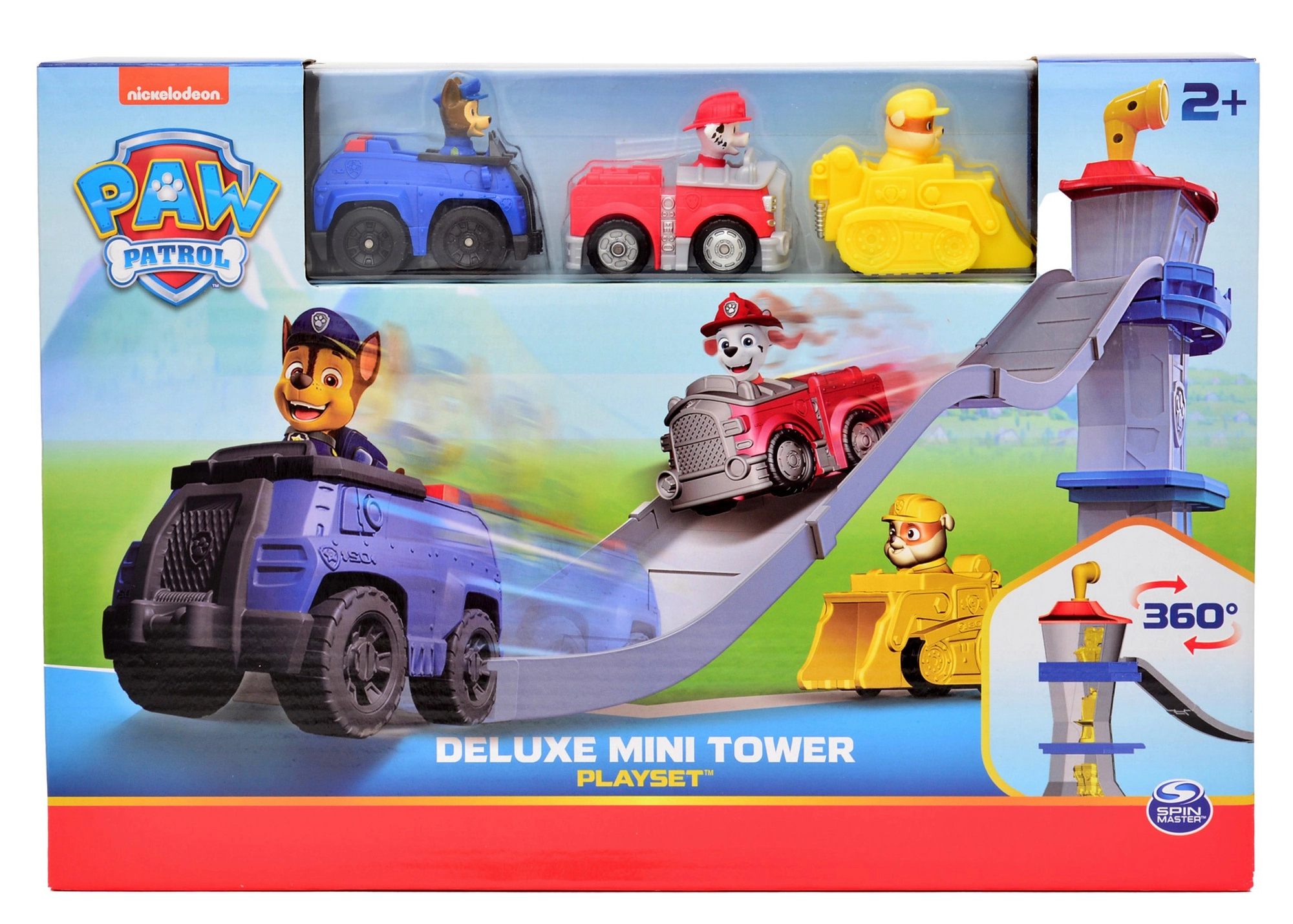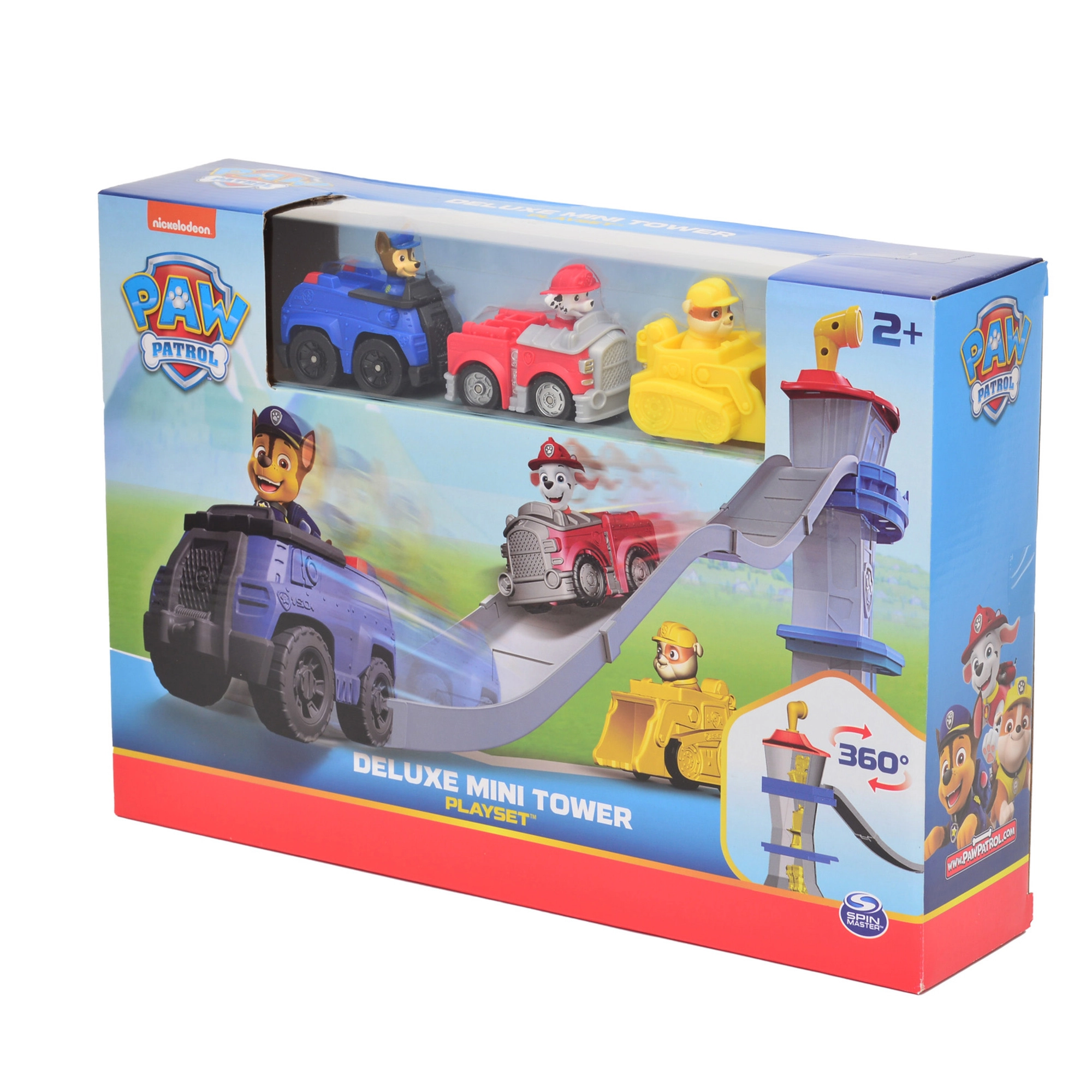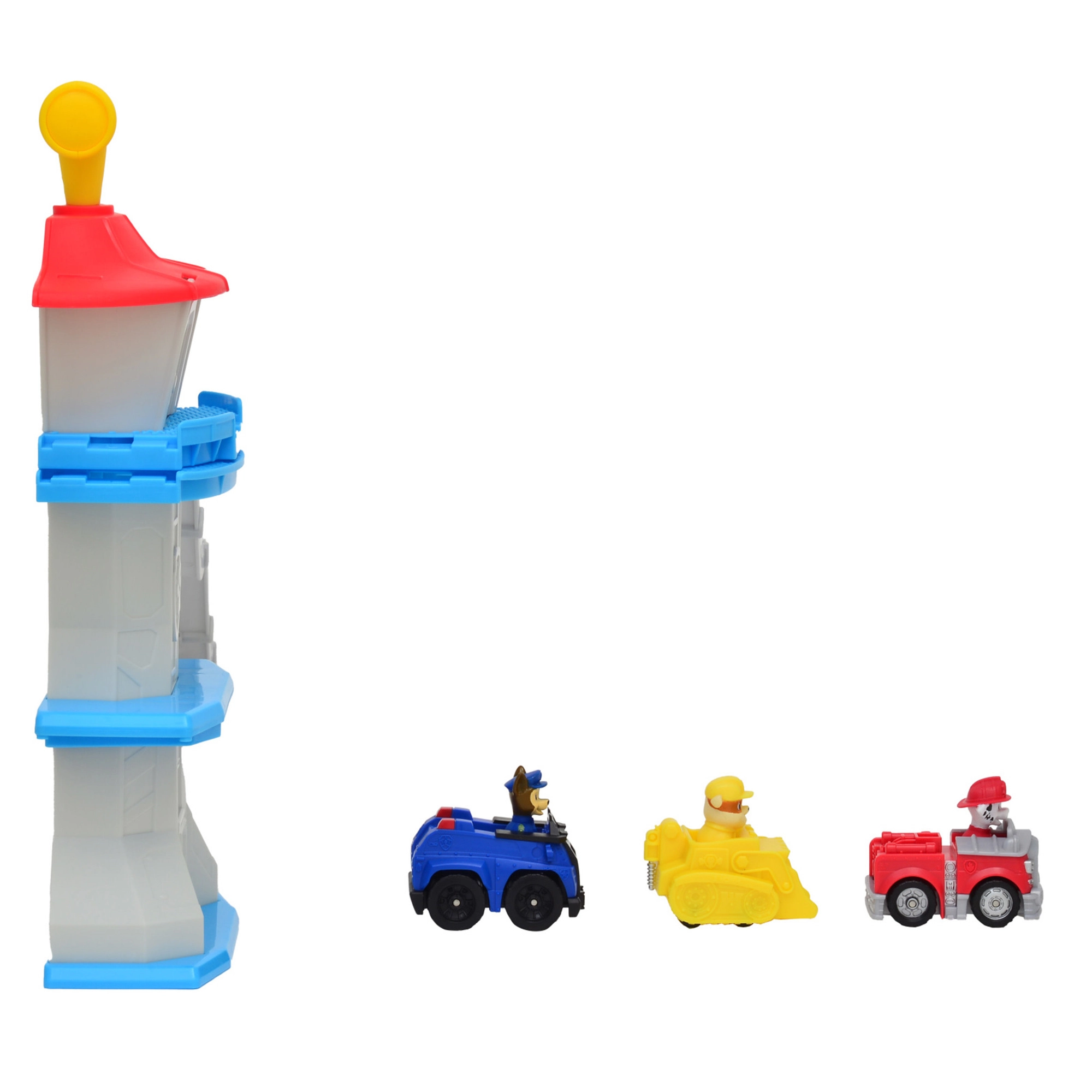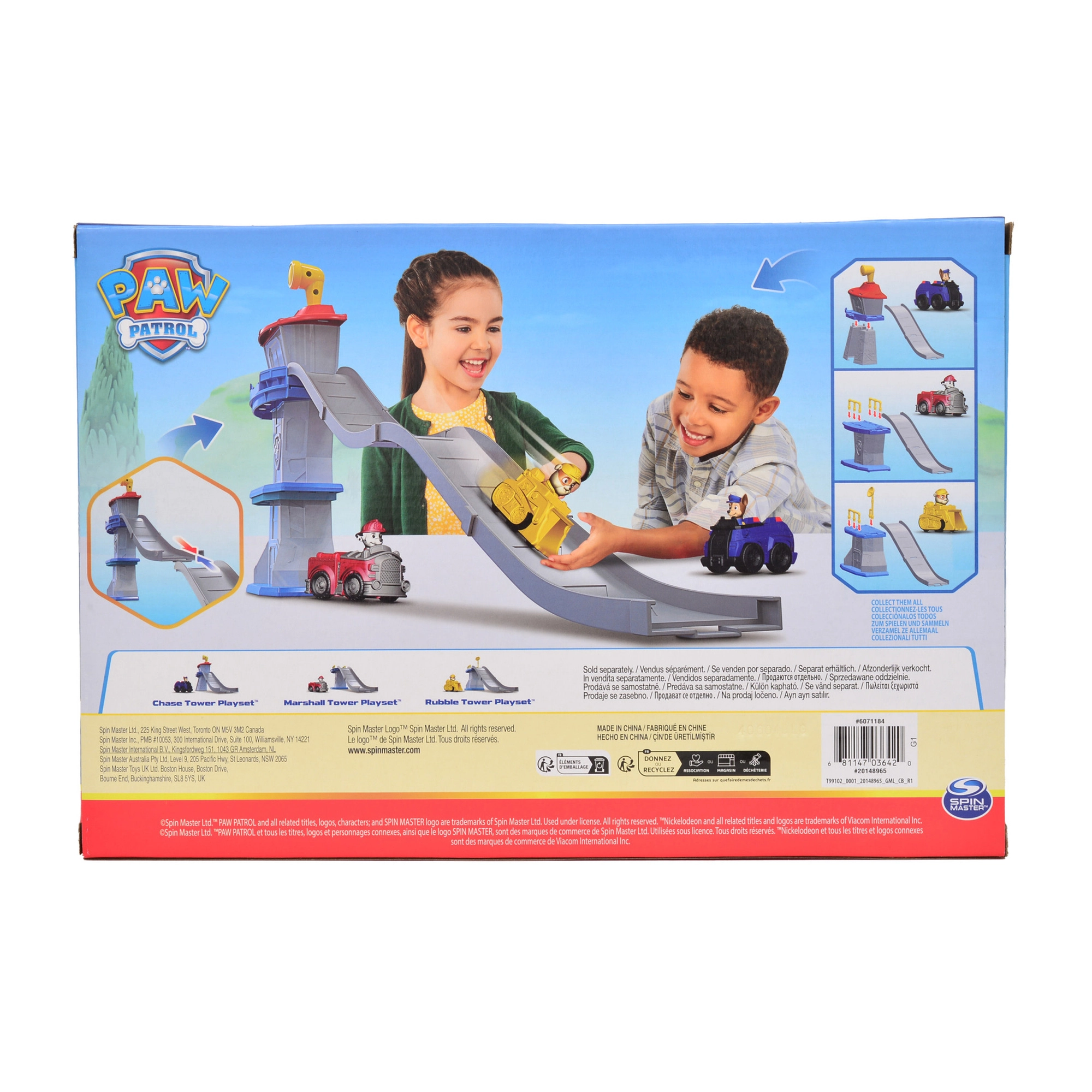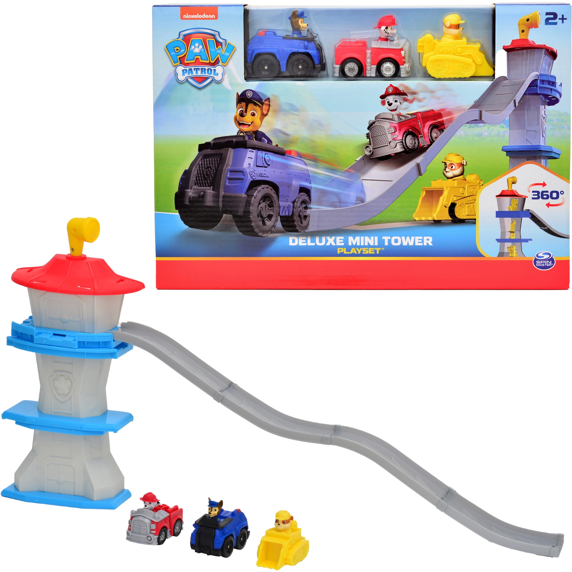 Erlebt Action wie in Adventure Bay! Dieser Turm mit langer Rampe und bunten Plattformen verweist originalgetreu auf die beliebte Welt von PAW Patrol. Enthalten sind 3 Mini-Autos mit Figuren – das Polizeiauto von Chase, das Feuerwehrauto von Marshall und Rubbles Bulldozer – bereit für die nächste Rettungsmission.