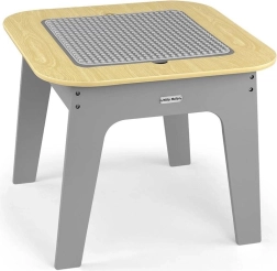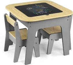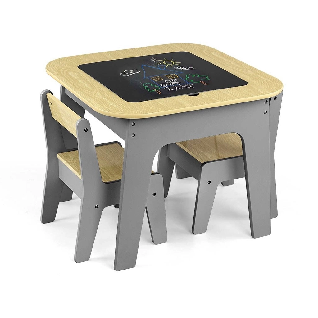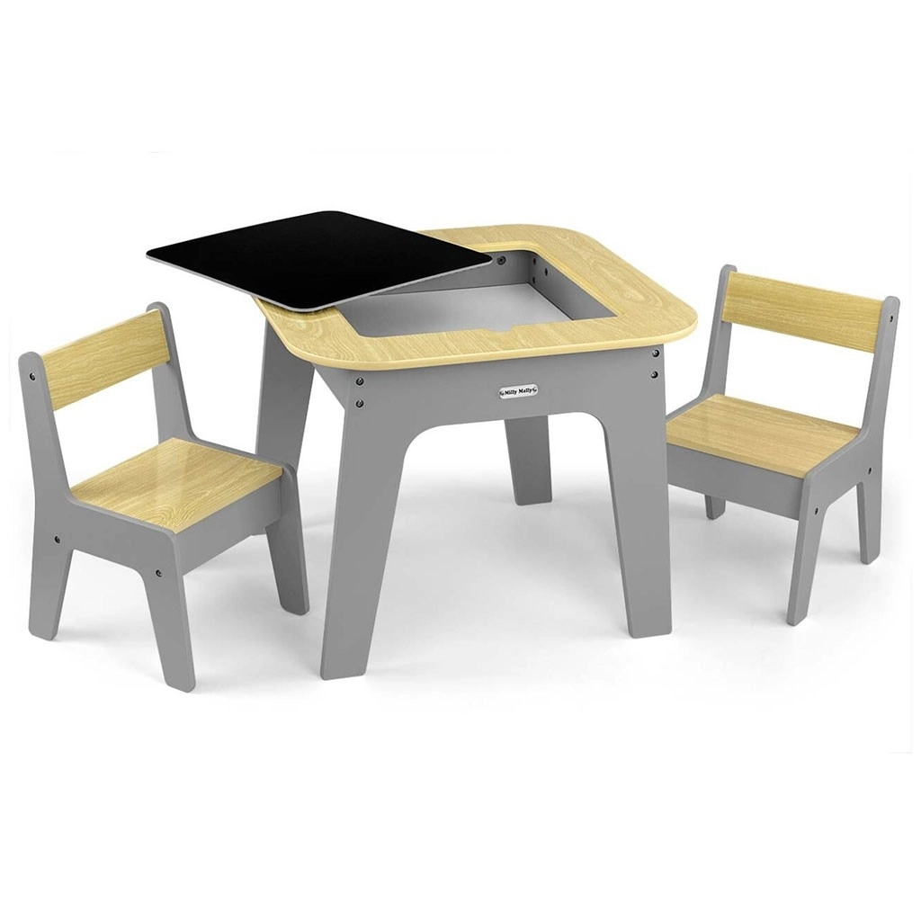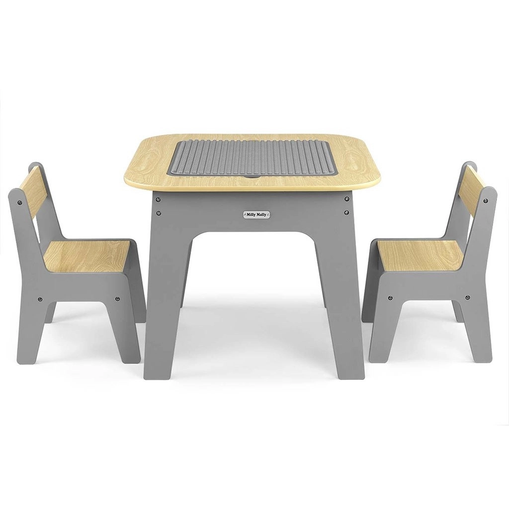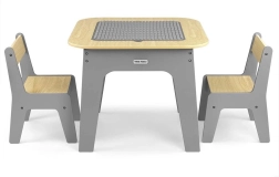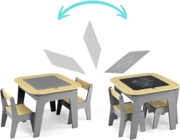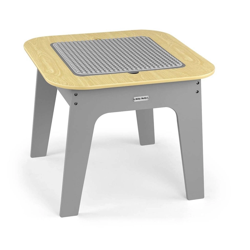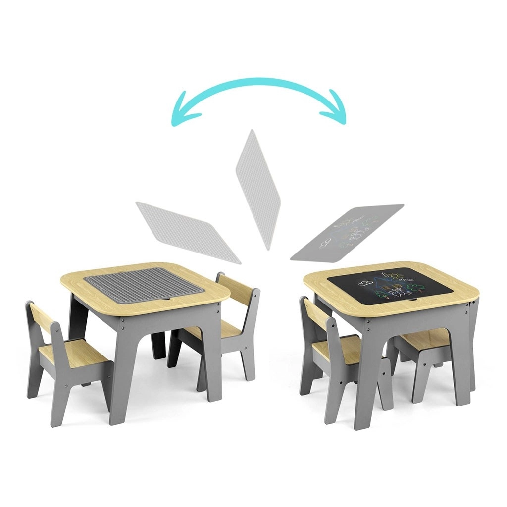 Entdecken Sie ein multifunktionales Set, das Kindern einen kreativen Raum zum Spielen, Zeichnen und Lernen bietet. Die beidseitige Tischplatte lässt sich leicht herausnehmen: Eine Seite bietet eine strukturierte Oberfläche zum Bauen mit Bausteinen, die andere eine Kreidetafel. Unter der Platte befindet sich ein cleverer Stauraum, der hilft, Ordnung im Kinderzimmer zu halten.