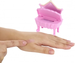 Der rosafarbene Schminktisch mit Deckel und Verzierungen bietet ein Fach für Kleinigkeiten. Kinder können Lacke, Sticker und Glosse ordnen und ihre eigene Beauty-Ecke gestalten.