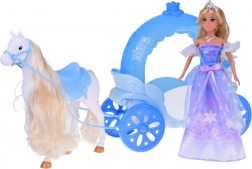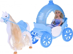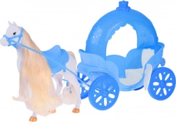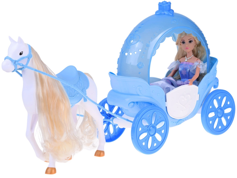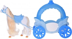 Das weiße Pferd mit langer Mähne ist gesattelt und bereit, die stilvolle „Kürbis“-Kutsche im königlichen Stil zu ziehen. Die Kutsche ist reich verziert, hat einen bequemen Sitz und rollt dank großer Räder sanft – perfekt für märchenhafte Fahrten und Rollenspiele.