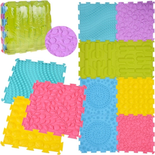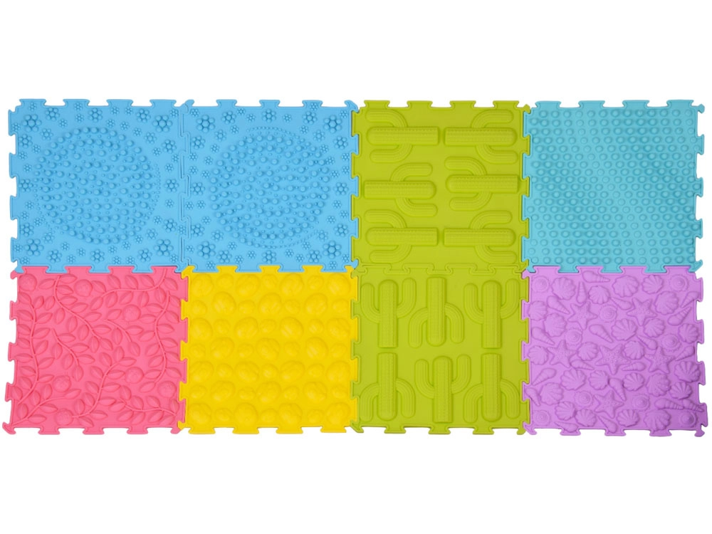 Die sensorische Matte aus acht miteinander verbindbaren Teilen (24,5 × 24,5 cm, Stärke ca. 1 cm) bietet vielfältige Texturen – Kakteen, Blätter mit Marienkäfern, Muscheln, Blüten sowie verschiedene Kuppeln und Punkte. Die einzelnen Teile können beliebig kombiniert und zu einem Rechteck, Streifen oder nahezu Quadrat zusammengesetzt werden, sodass Sie die Fläche leicht an Raum und Aktivität anpassen.