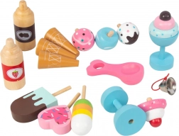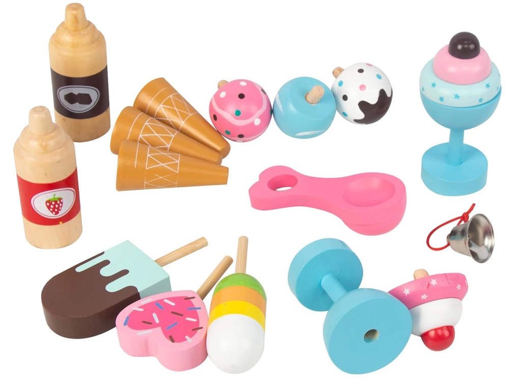 Sirups, Becher, Waffeln, Eis am Stiel und Eiskugel-Löffel – alles für eine authentische Eisdiele, ergänzt durch Glöckchen und Haken.