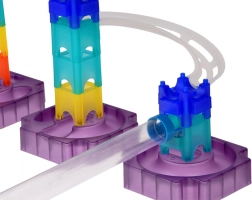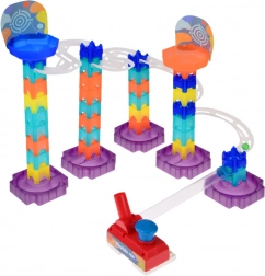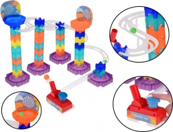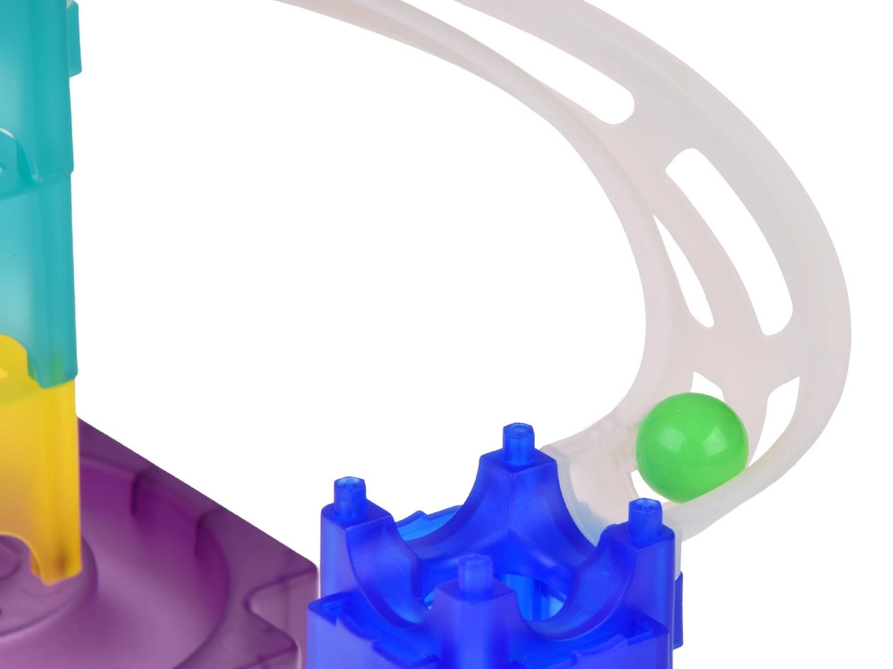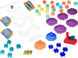 Enthalten sind eine manuelle Abschussvorrichtung für einen dynamischen Start, Kurven, Trichter und Verbindungsteile in leuchtenden Farben, die zum Spielen einladen. Das Set fördert die Augen-Hand-Koordination, technisches Denken und die Kreativität der ganzen Familie.