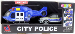 Entdecken Sie die actionreiche Welt der Polizeieinsätze mit dem City Police Set, das einen Hubschrauber mit Licht und Sound sowie ein Auto mit mechanischem Antrieb beinhaltet. Realistische Details wie rotierende Rotorblätter, öffnende Türen und ein Rettungshaken fördern die Fantasie und die motorischen Fähigkeiten der Kinder.