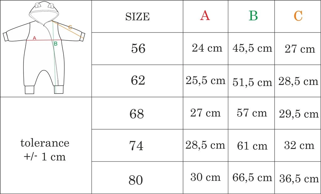 Praktische Details erleichtern den Alltag: Reißverschluss über die gesamte Länge für schnelles Wickeln und Anziehen, umschlagbare Ärmelbündchen mit wärmendem Futter und weichem „Fellchen“, mit denen sich die Händchen bedecken lassen – ganz ohne Handschuhe. Das Material ist hochwertig, weich und formstabil, sodass es auch nach wiederholtem Tragen und Waschen gut aussieht.