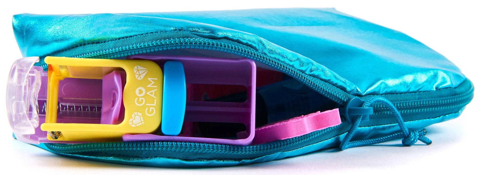Die glitzernde Reißverschlusstasche hält Lacke, Kassetten und den Stempel zusammen. Ideal zum Transport und zur sicheren Aufbewahrung des gesamten Sets.