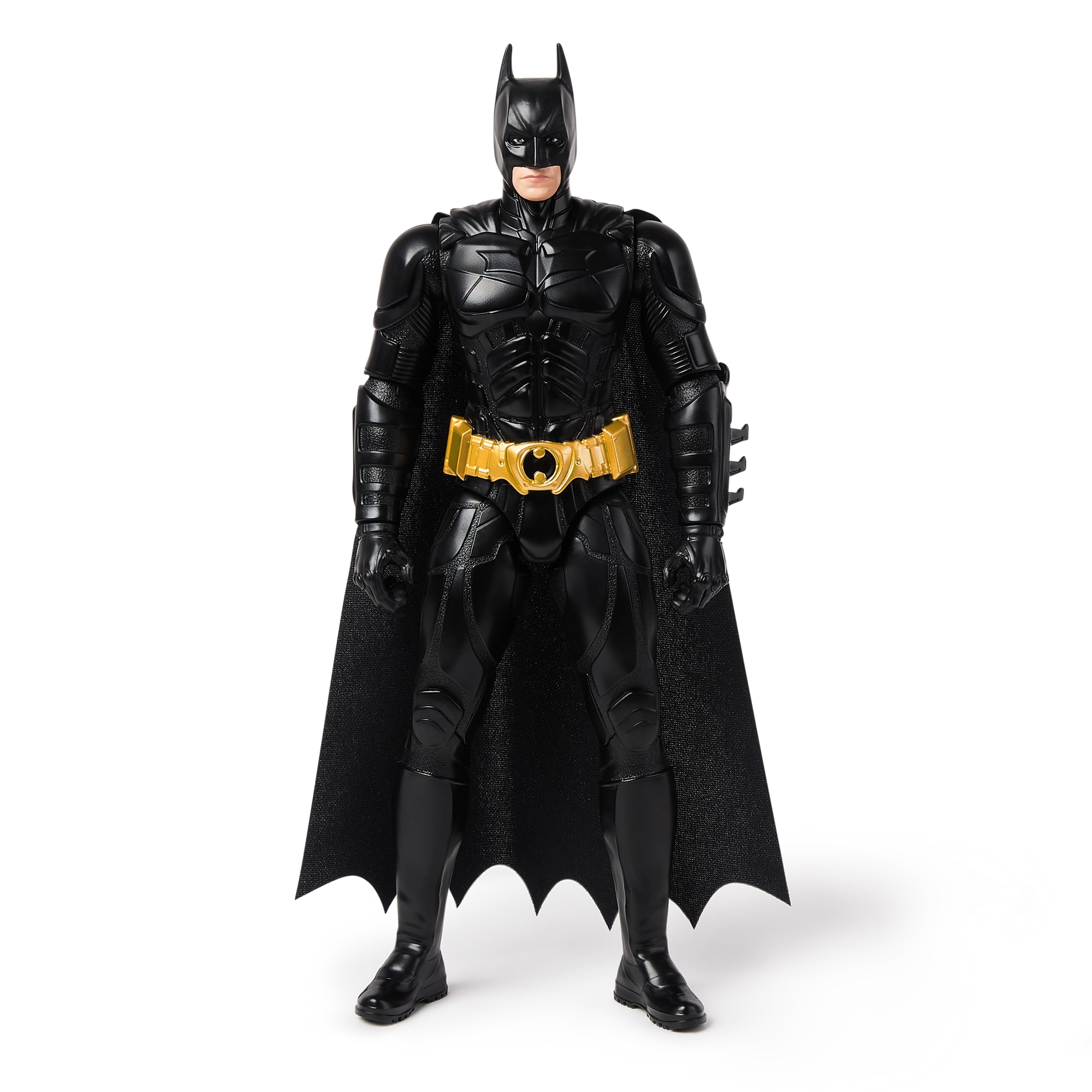 Der schwarze Anzug mit goldenem Gürtel, die geformte Rüstung und der lange Umhang fangen das Filmdesign von BATMAN aus The Dark Knight originalgetreu ein.