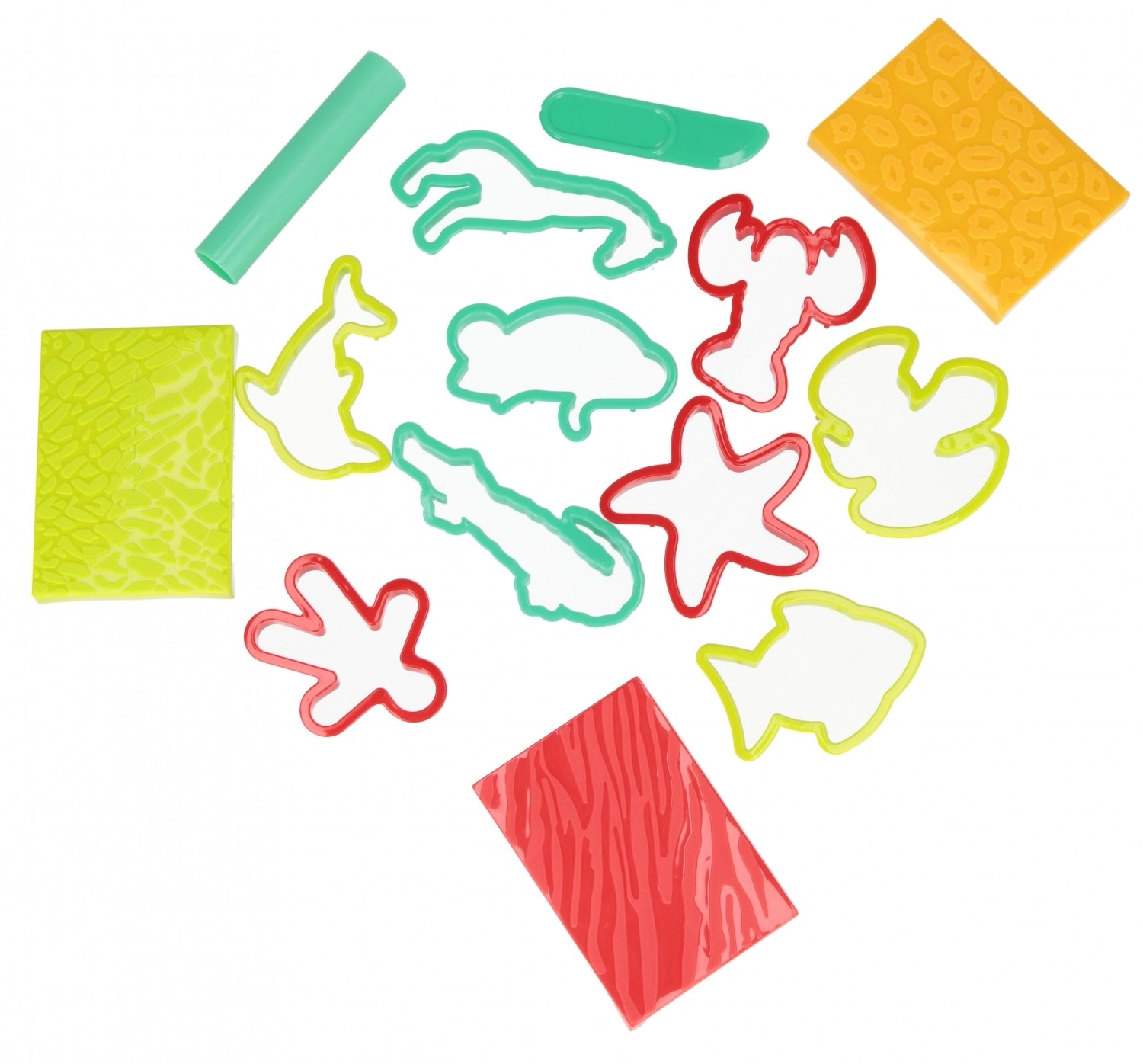 Verschiedene Förmchen und strukturierte Elemente ermöglichen das Gestalten von Tieren und Mustern. Ideal zur Förderung von Fantasie und Feinmotorik.