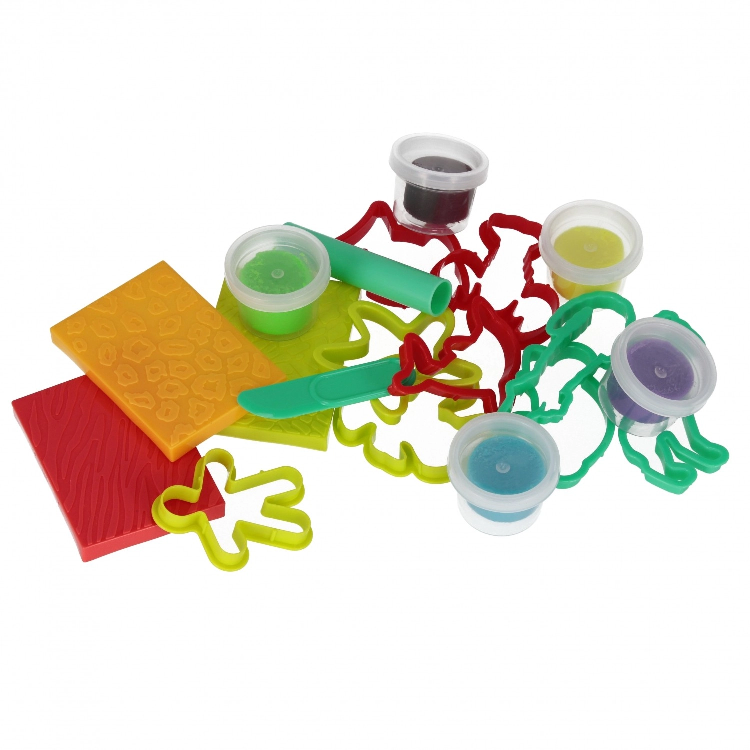 Becher mit bunter Knetmasse, Ausstecher, Stempel, Rolle und Messer. Kinder können direkt nach dem Auspacken loslegen – ohne zusätzliche Käufe.