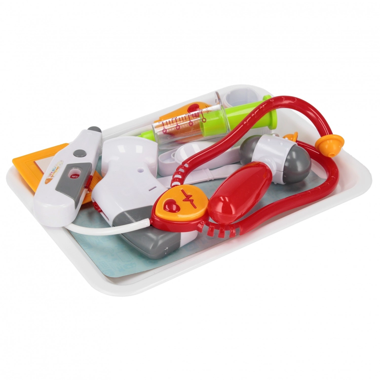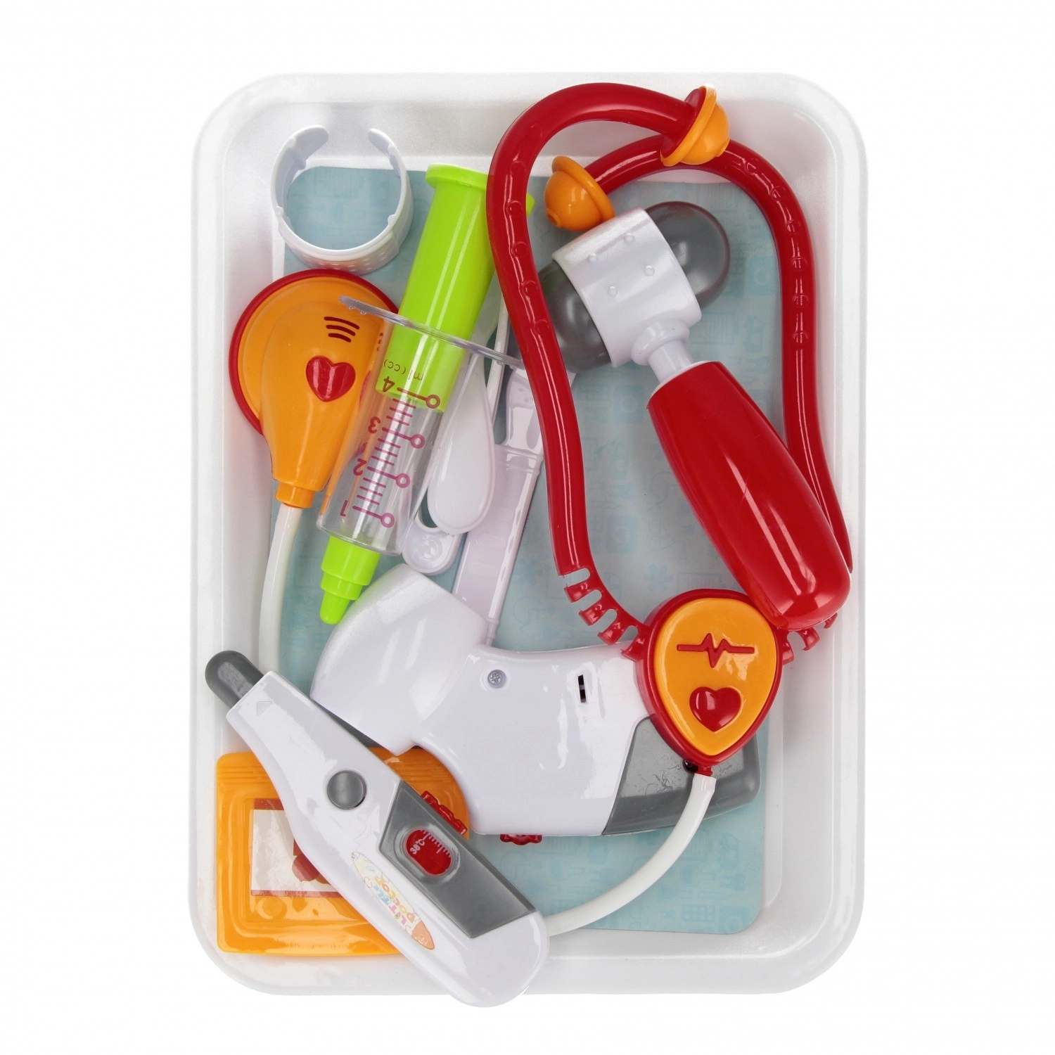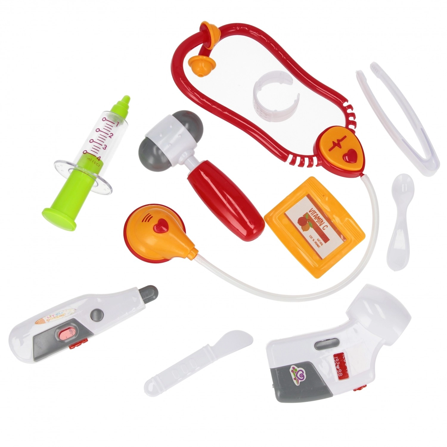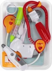 Zum Lieferumfang gehören Tablett, Stethoskop, Spritze, Pinzette, Pflaster, Messer, Löffel, Reflexhammer, Pulsoximeter, Thermometer und ein Ausweis. Ideal für gemeinsames Spiel unter Geschwistern und Freundinnen/Freunden sowie für die erste Begegnung mit der Welt der Medizin in Form eines sicheren Nachahmungsspiels.