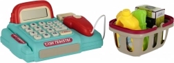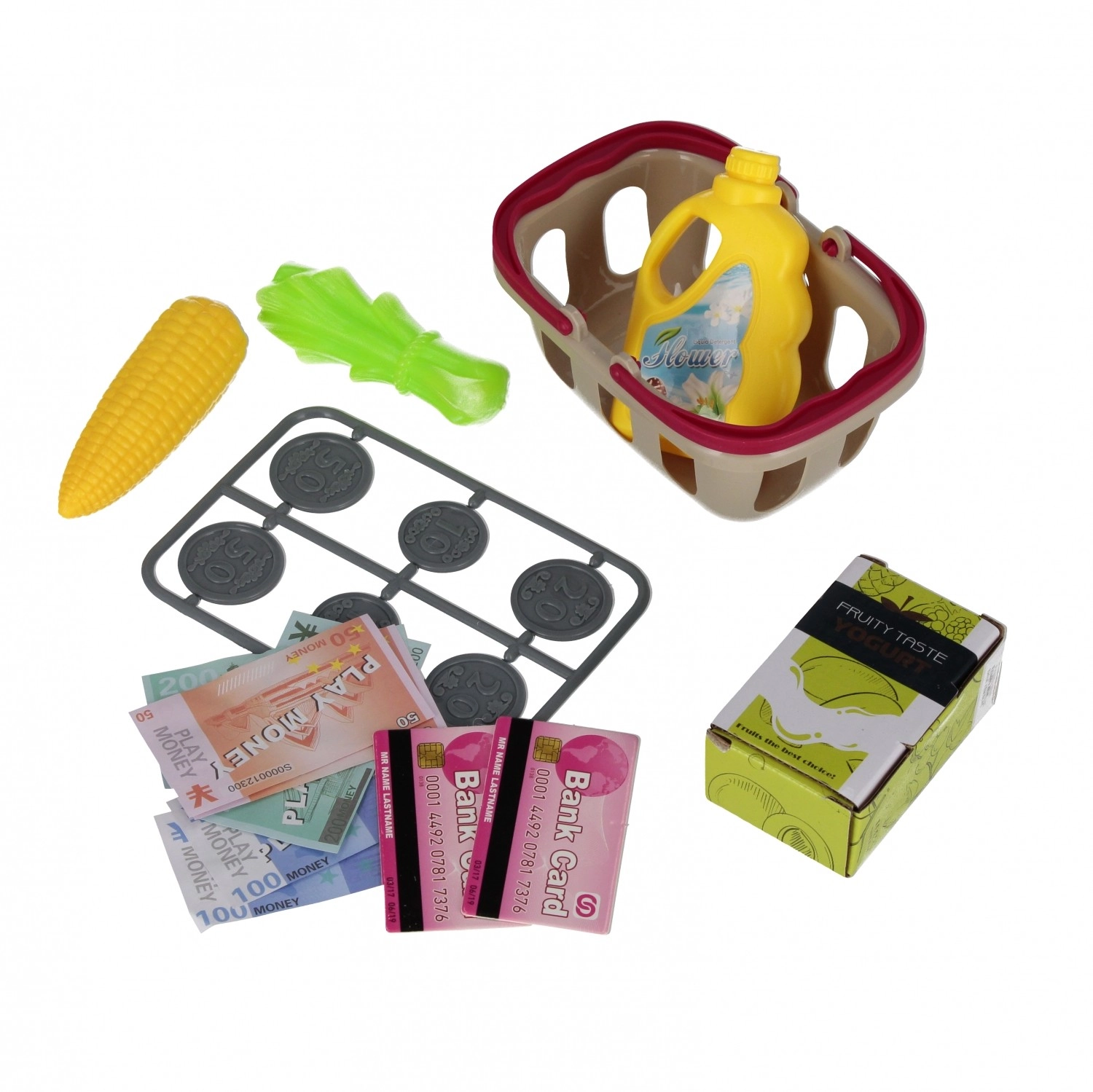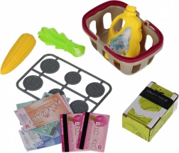 Enthalten sind Kunststofflebensmittel, ein Einkaufskorb, Spielgeldscheine und -münzen – alles Nötige für ein komplettes Kaufladen-Spiel.