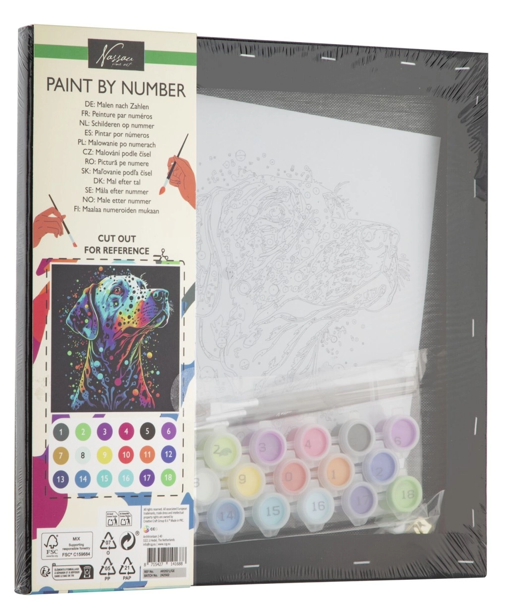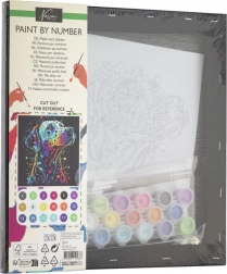 Lieferumfang: 1× Leinwand mit vorgedrucktem Motiv, Set mit Acrylfarben, 1× Pinsel, gedruckte Anleitung.