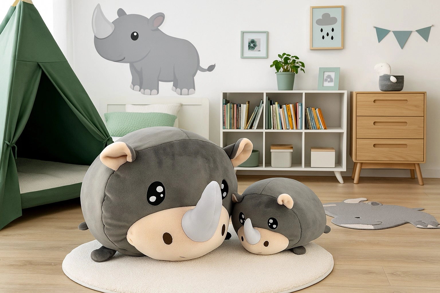 Das kleinere Nashorn (20 cm) ist ideal für Kinderwagen oder Bettchen als Schmusefreund, das größere (40 cm) eignet sich als Kissen fürs Auto, auf Reisen oder als gemütliche Deko im Kinderzimmer. Die Pflege ist einfach – einfach bei 30 °C waschen.