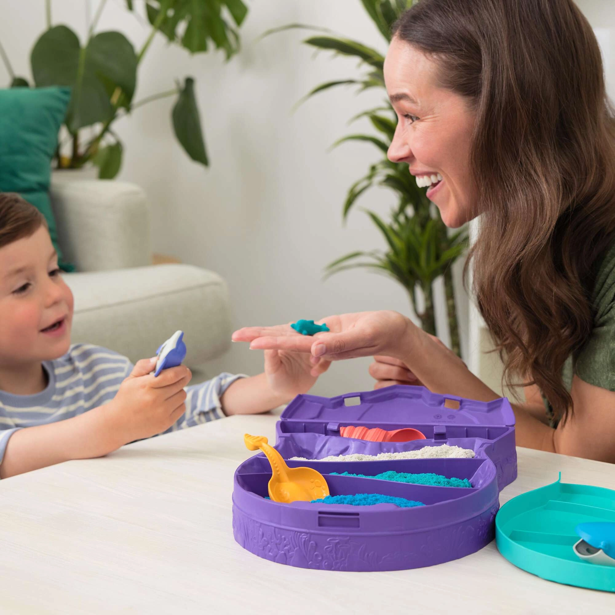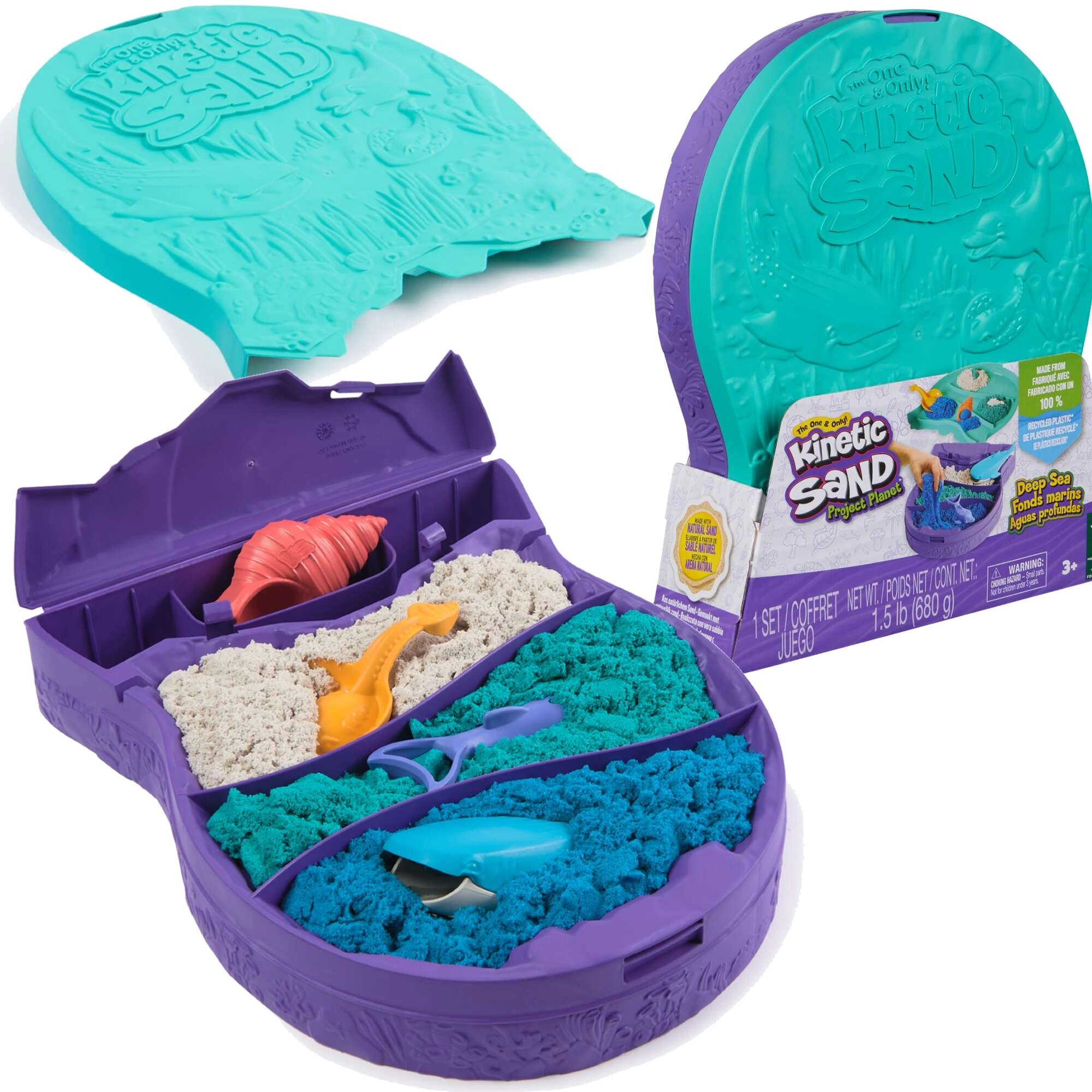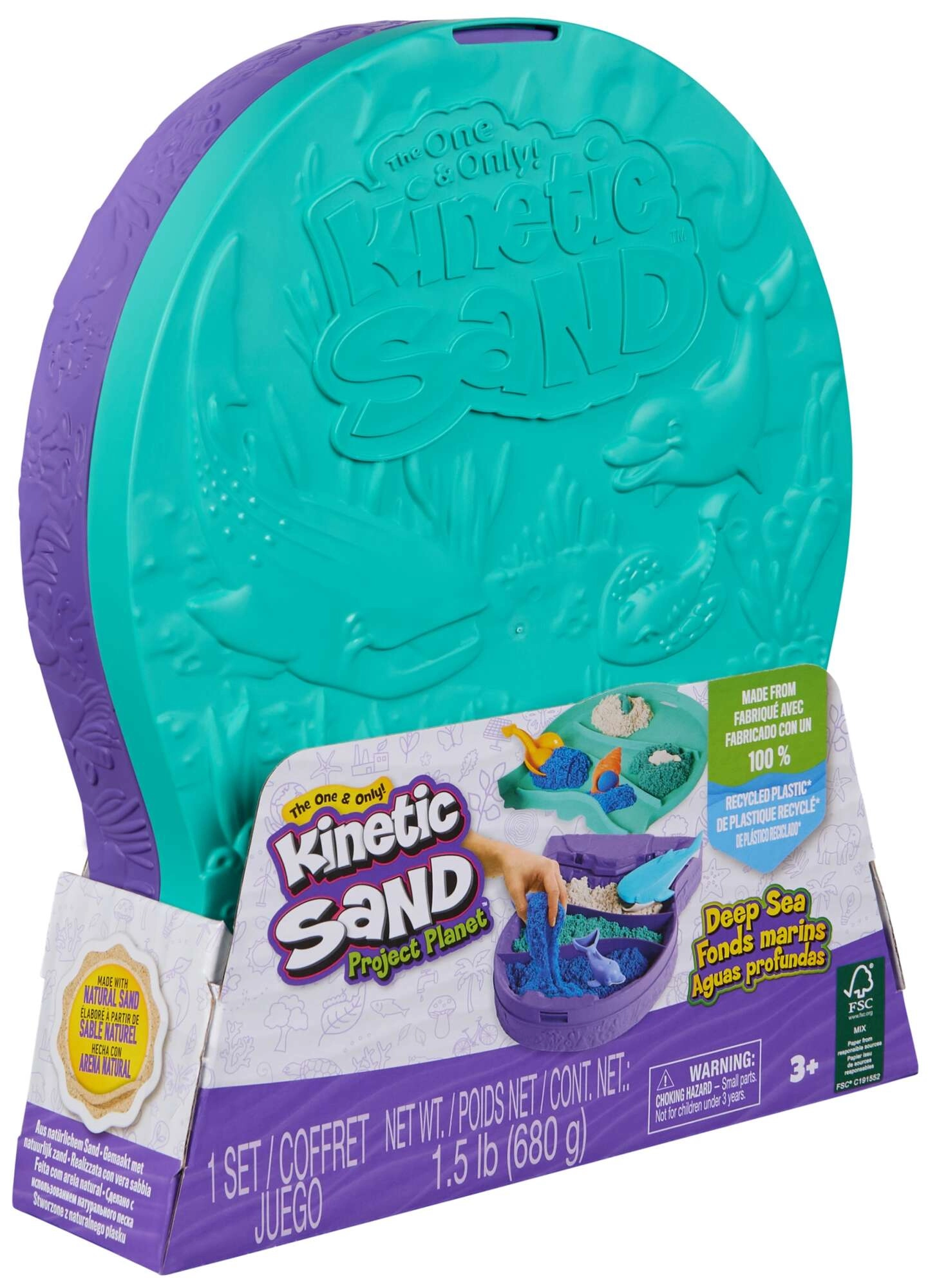 Kinetic Sand imitiert das Gefühl von nassem Sand, jedoch ohne Schmutz und ohne auszutrocknen. Kinder können leicht modellieren, schneiden, drücken und bauen und trainieren dabei Koordination und Kreativität. Das Deep Sea Set bietet eine Kombination aus Blau, Weiß und Grün für die Gestaltung lustiger Unterwasserszenen und -formen.