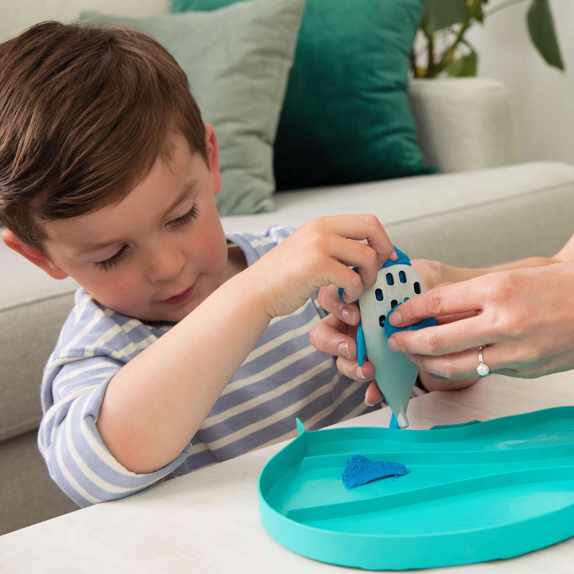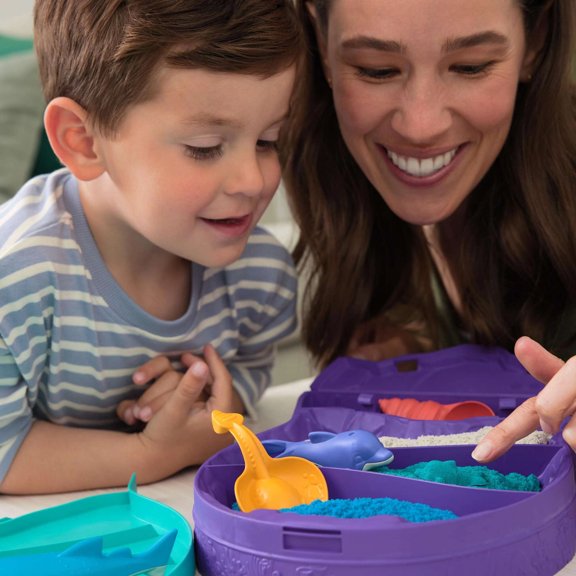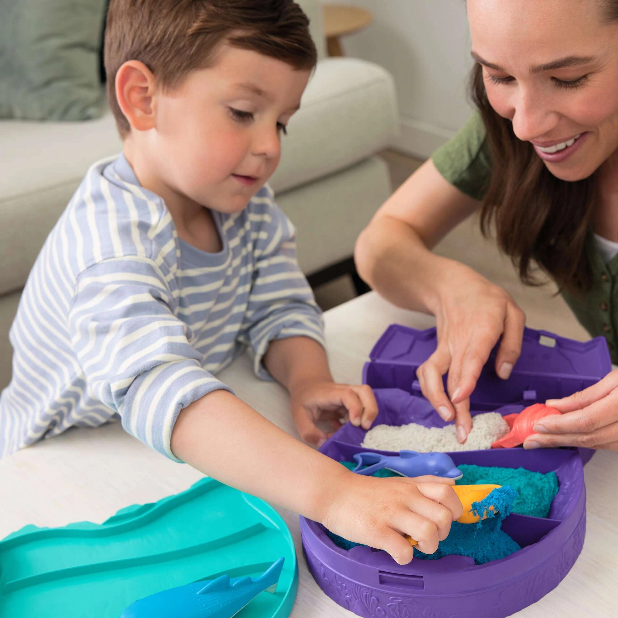 Kinetic Sand imitiert das Gefühl von nassem Sand, jedoch ohne Schmutz und ohne auszutrocknen. Kinder können leicht modellieren, schneiden, drücken und bauen und trainieren dabei Koordination und Kreativität. Das Deep Sea Set bietet eine Kombination aus Blau, Weiß und Grün für die Gestaltung lustiger Unterwasserszenen und -formen.