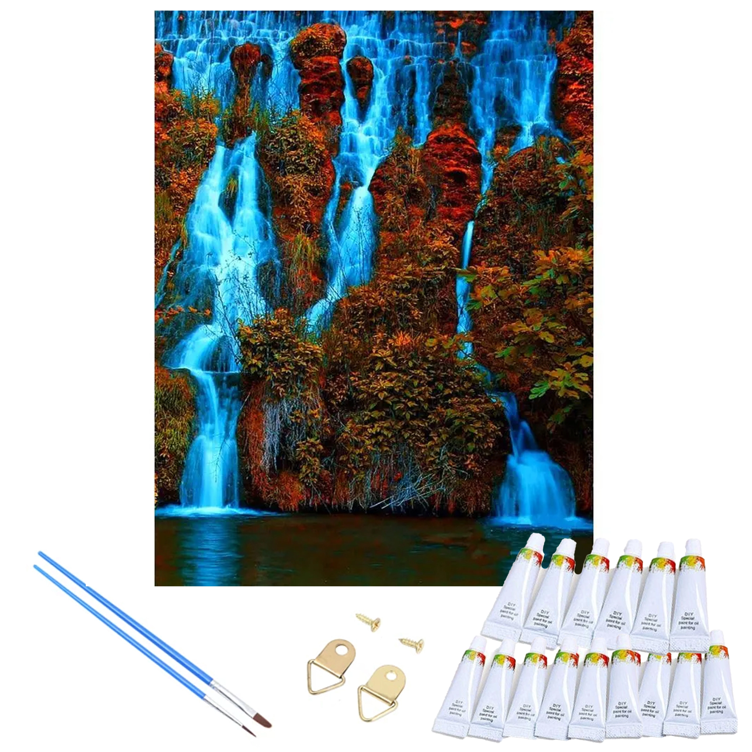 Im Paket finden Sie eine vordruckte Leinwand, Acrylfarben und Pinsel – alles, was Sie für das Malen des 40 × 50 cm großen Wasserfalls benötigen.