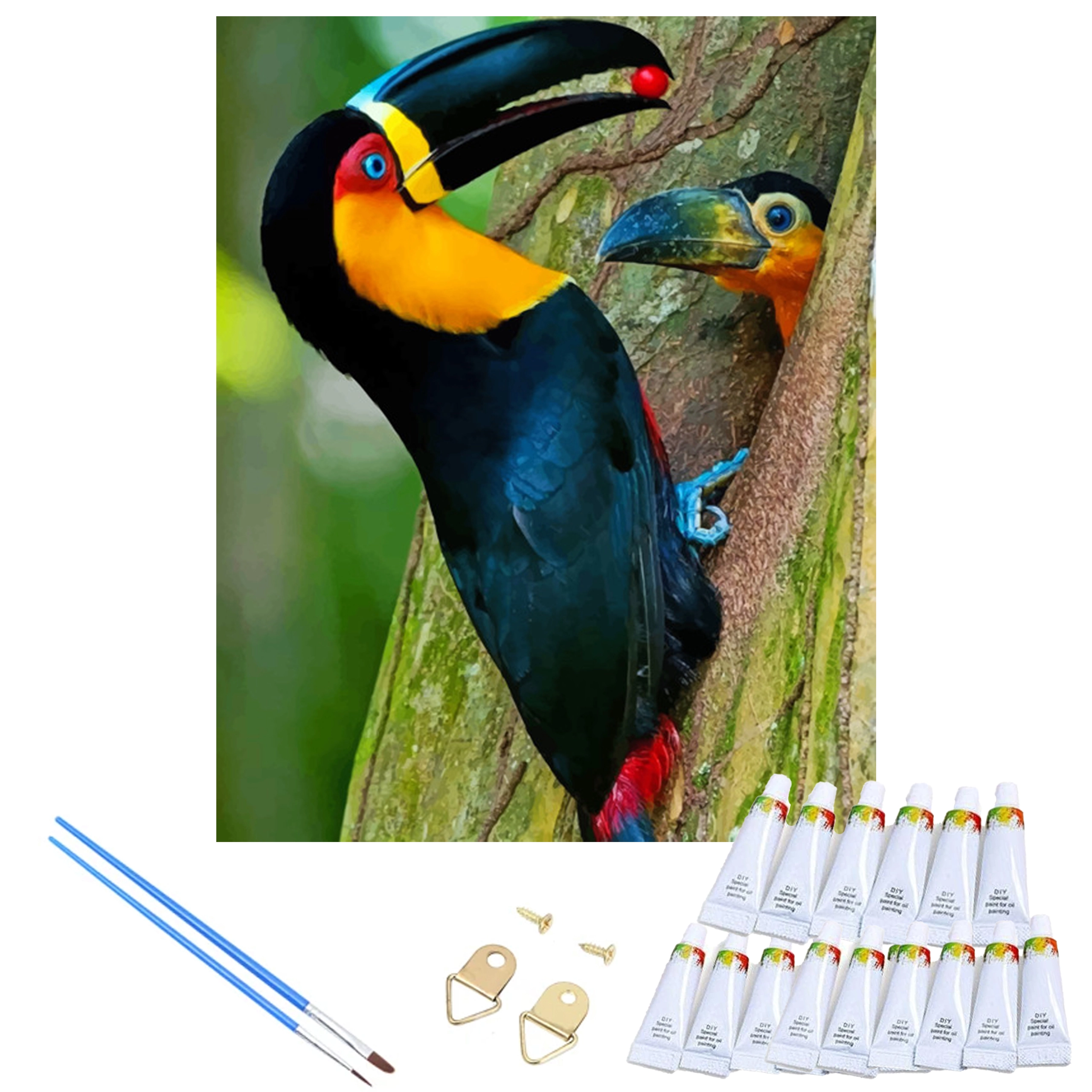 Dieses komplette DIY-Set ermöglicht es Ihnen, ohne Vorkenntnisse ein eindrucksvolles Bild mit einem exotischen Tukan-Motiv zu gestalten. Jedes nummerierte Feld auf der Leinwand entspricht einem bestimmten Farbton und garantiert so ein einfaches, unterhaltsames und entspannendes Malerlebnis. Dank der Spannung auf dem hölzernen Keilrahmen können Sie direkt nach dem Auspacken beginnen und das fertige Werk sofort aufhängen.