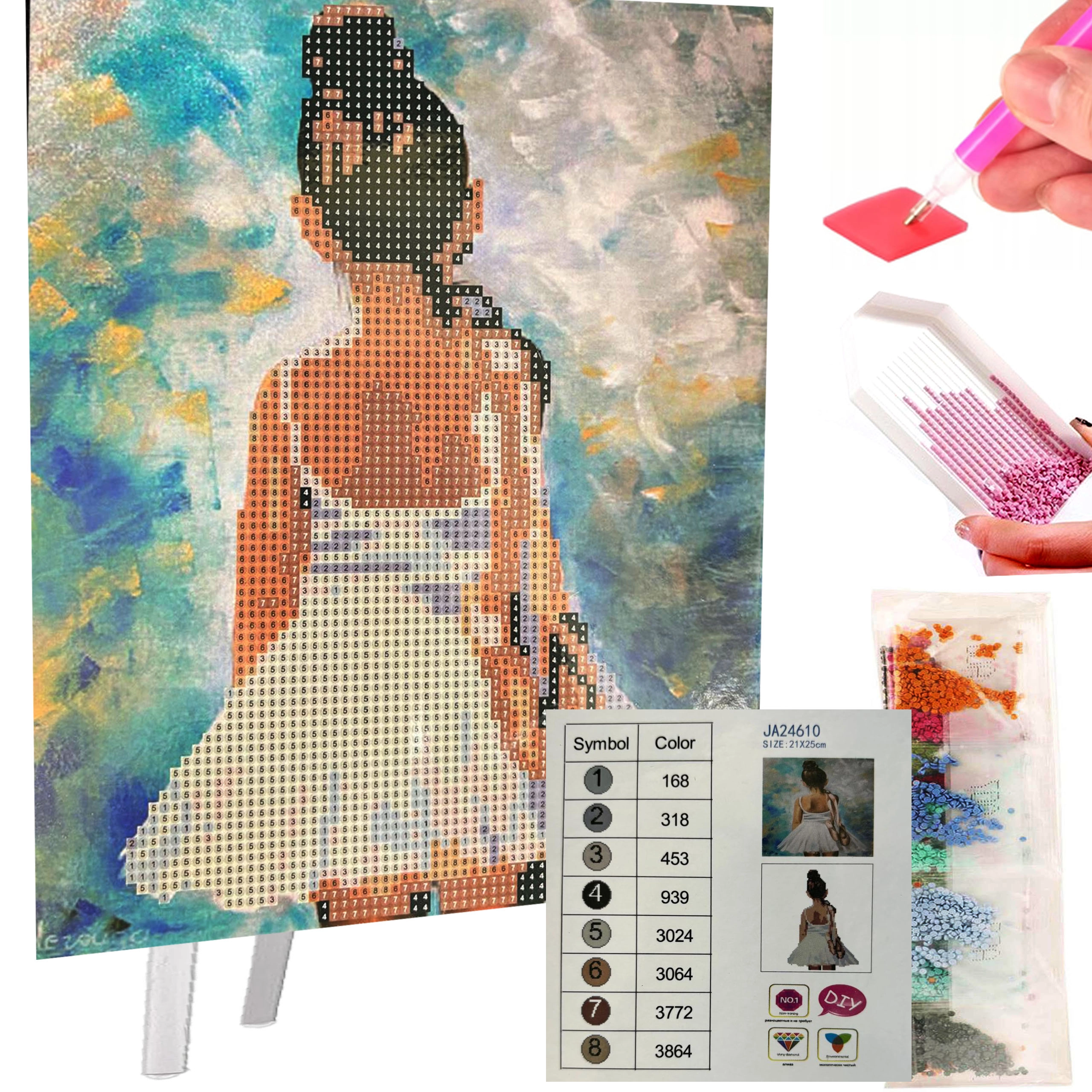 Entdecken Sie die Magie der Diamantmosaik – eine einfache und beruhigende Methode, um schrittweise funkelnde Bilder zu gestalten. Das Set enthält alles, um sofort loszulegen: bedruckte Leinwand mit Motiv, funkelnde Steinchen, Applikator, Wachs und Schälchen zur übersichtlichen Sortierung. Das fertige Bild stellen Sie dank des weißen Ständers, der im Lieferumfang enthalten ist, ganz einfach aus.
