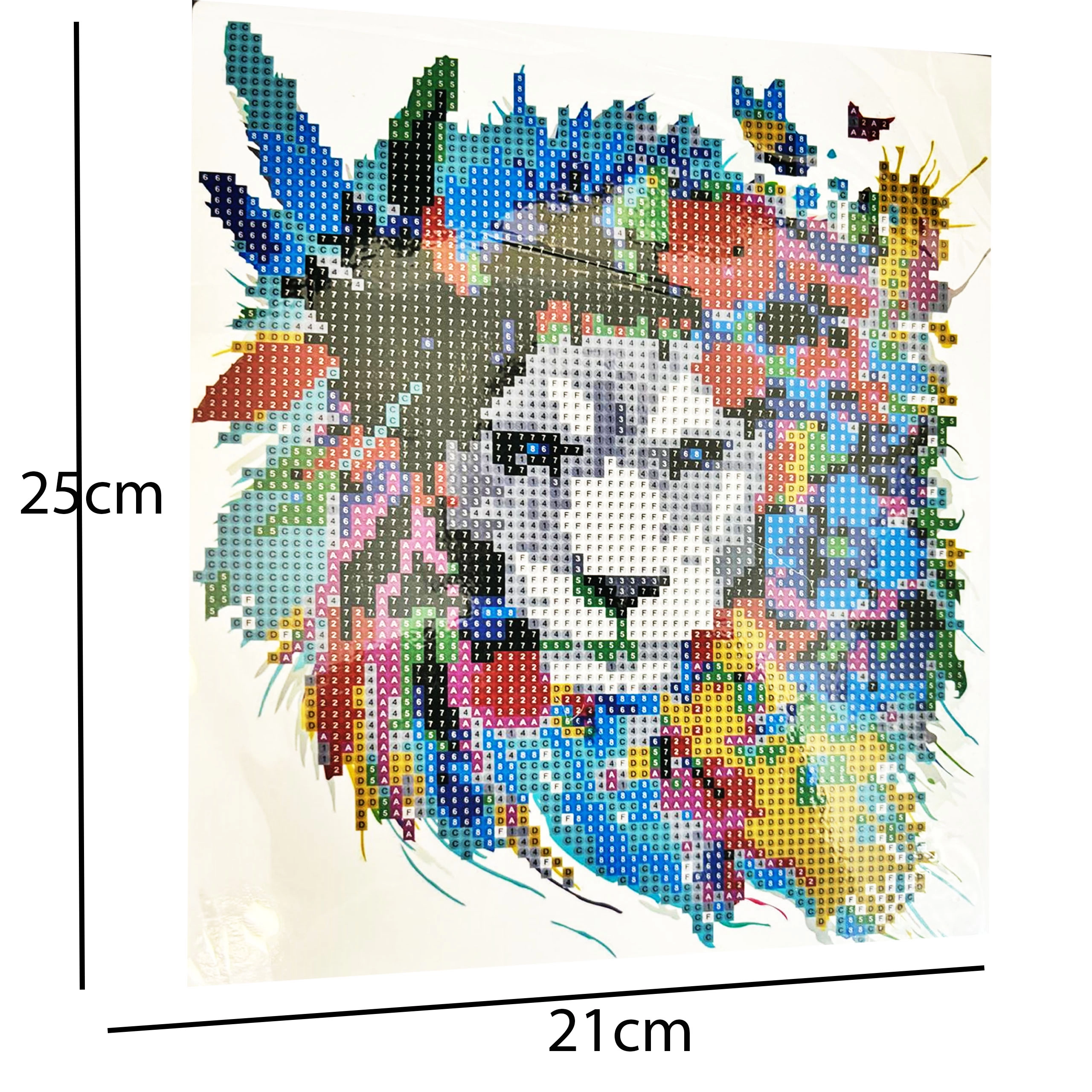 Alles Nötige ist im Set enthalten: selbstklebende Leinwand 21 × 25 cm, Resin-Steinchen in vielen Farben, Applikator mit Wachs für präzises Aufnehmen und ein geriffeltes Schälchen zum einfachen Ausrichten der „Drills“. Das Set ist perfekt für Einsteiger und fördert Feinmotorik, Konzentration und Geduld.