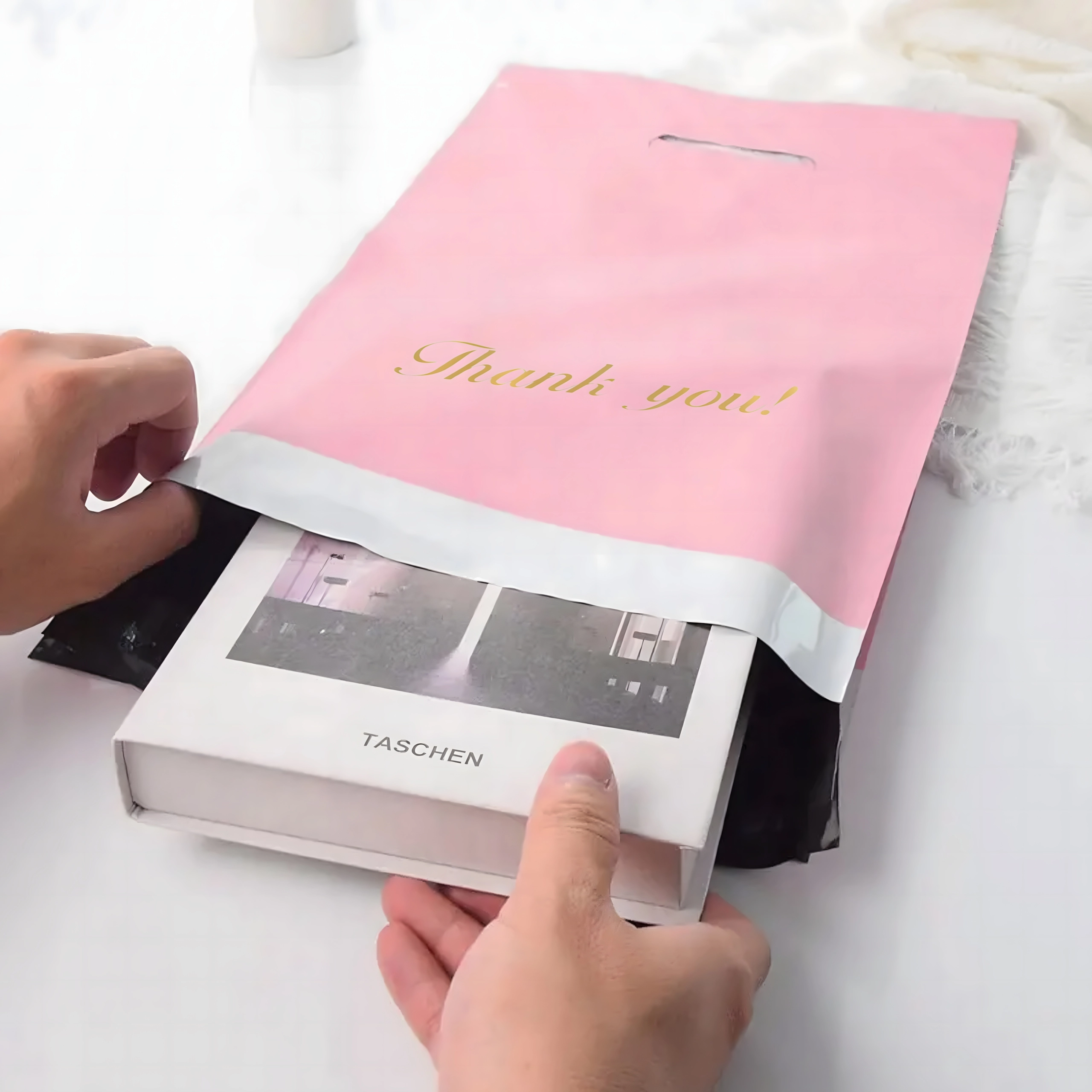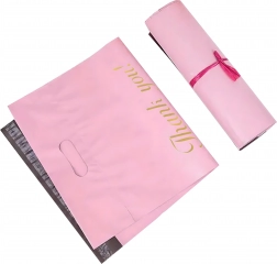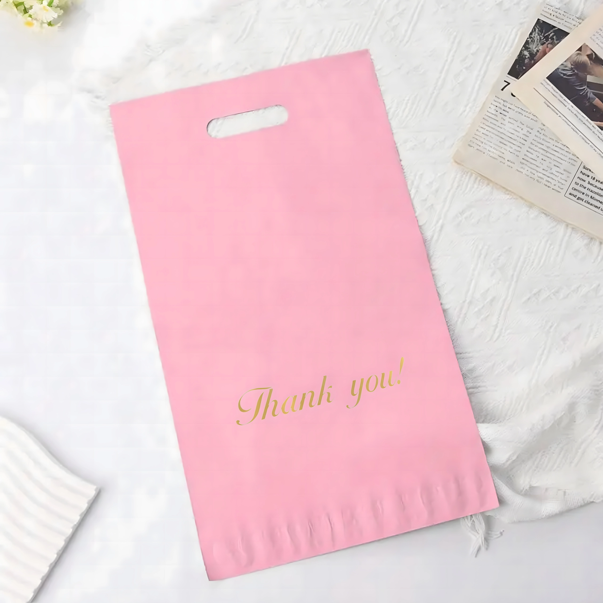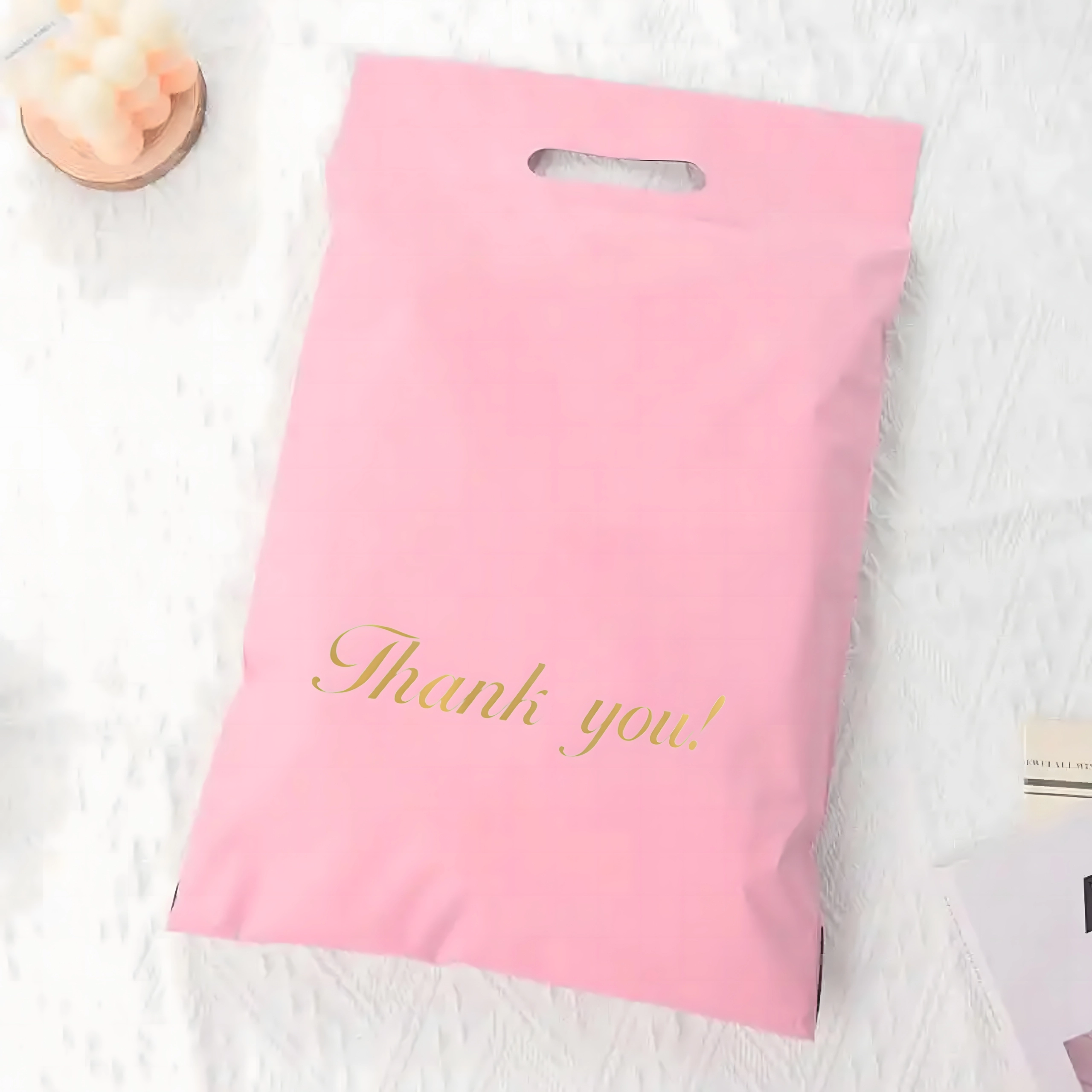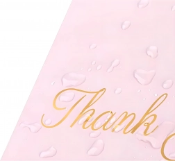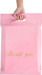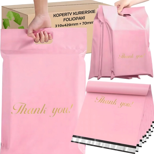 Robuste Versandbeutel aus LDPE mit Griff sind ideal für E‑Commerce-Sendungen und Geschenkverpackungen. Der Selbstklebestreifen gewährleistet einen manipulationssicheren Verschluss, das wasserabweisende Material schützt den Inhalt vor Feuchtigkeit, Staub und Schmutz. Das rosafarbene Design mit dem Aufdruck „Thank you!“ verleiht Ihren Sendungen ein professionelles und freundliches Erscheinungsbild.