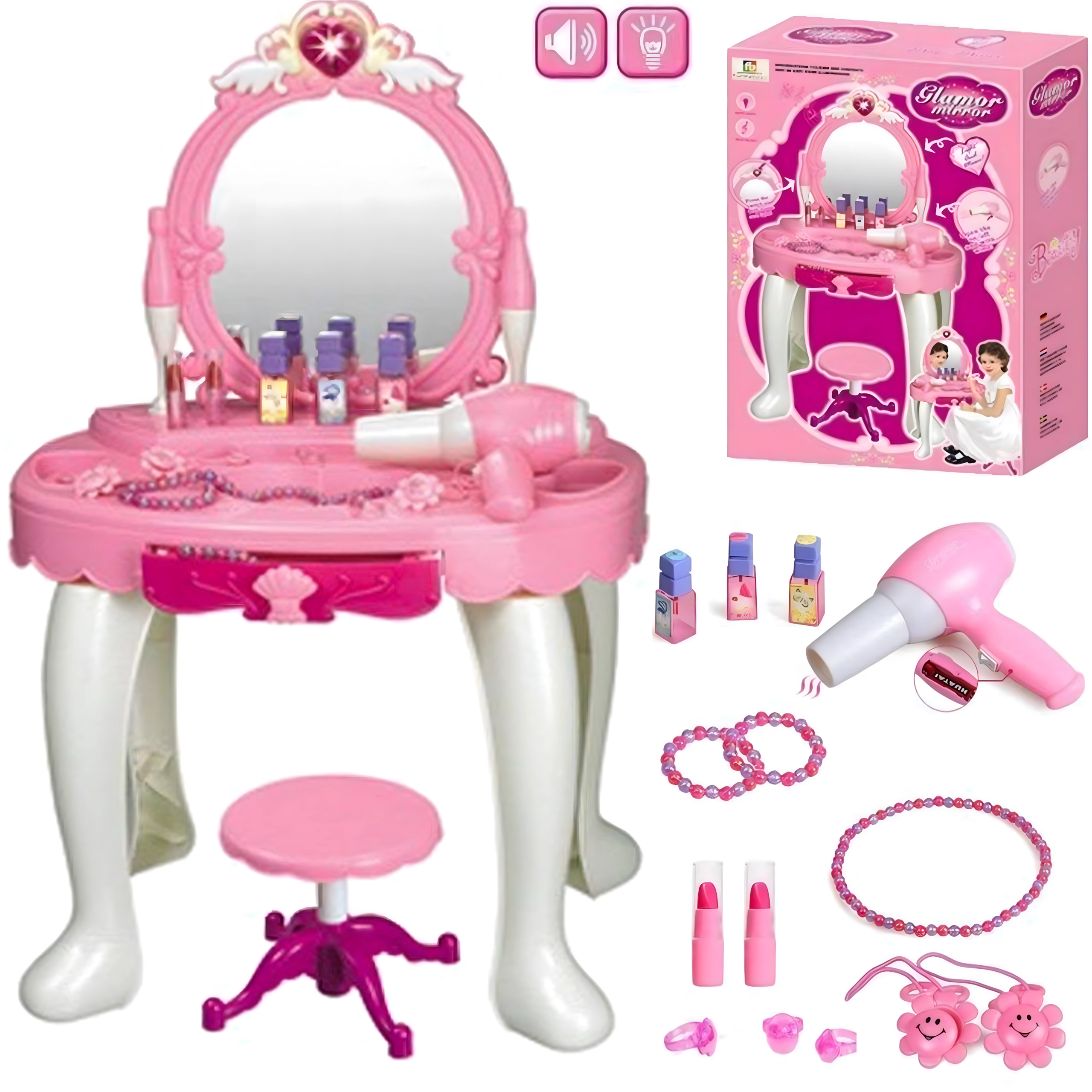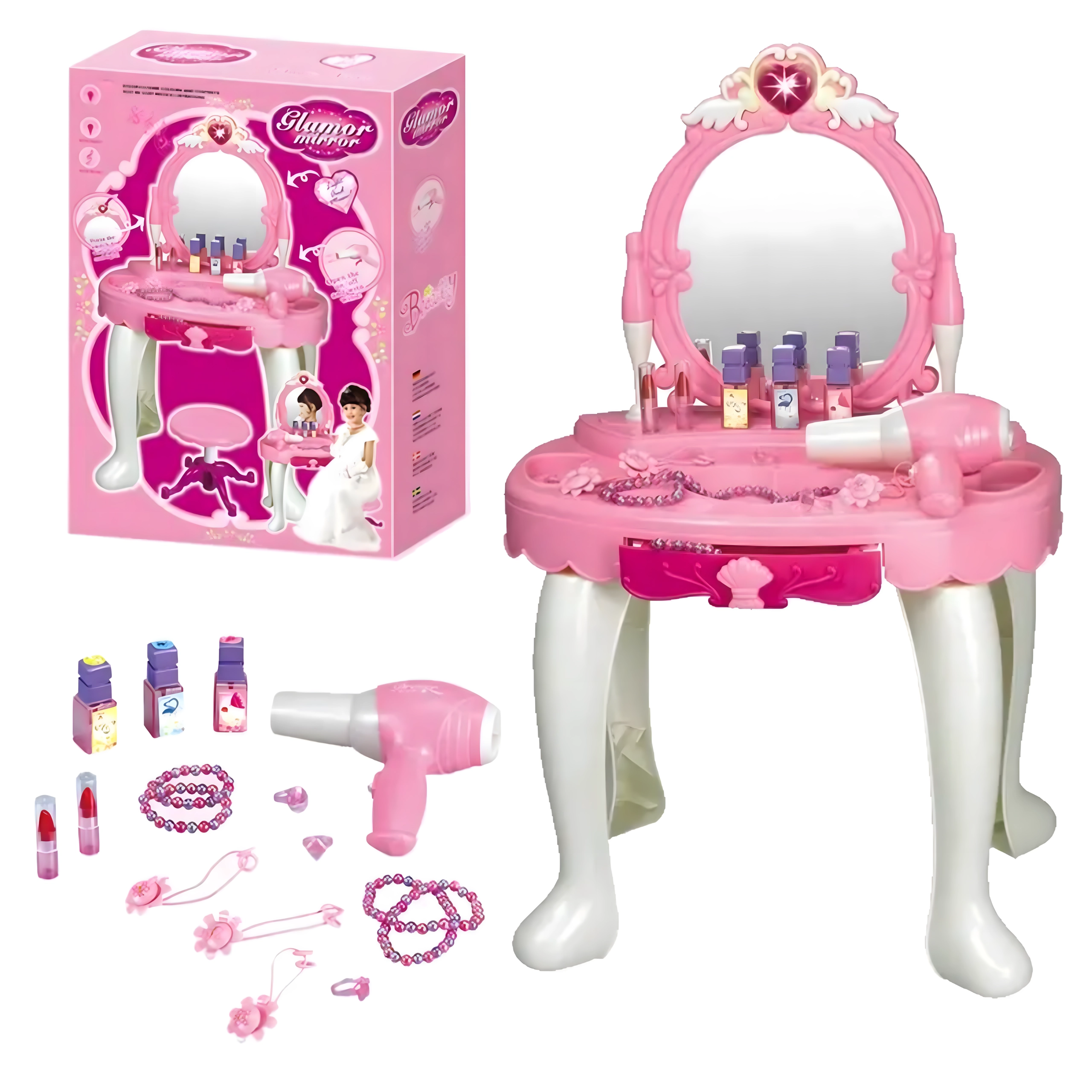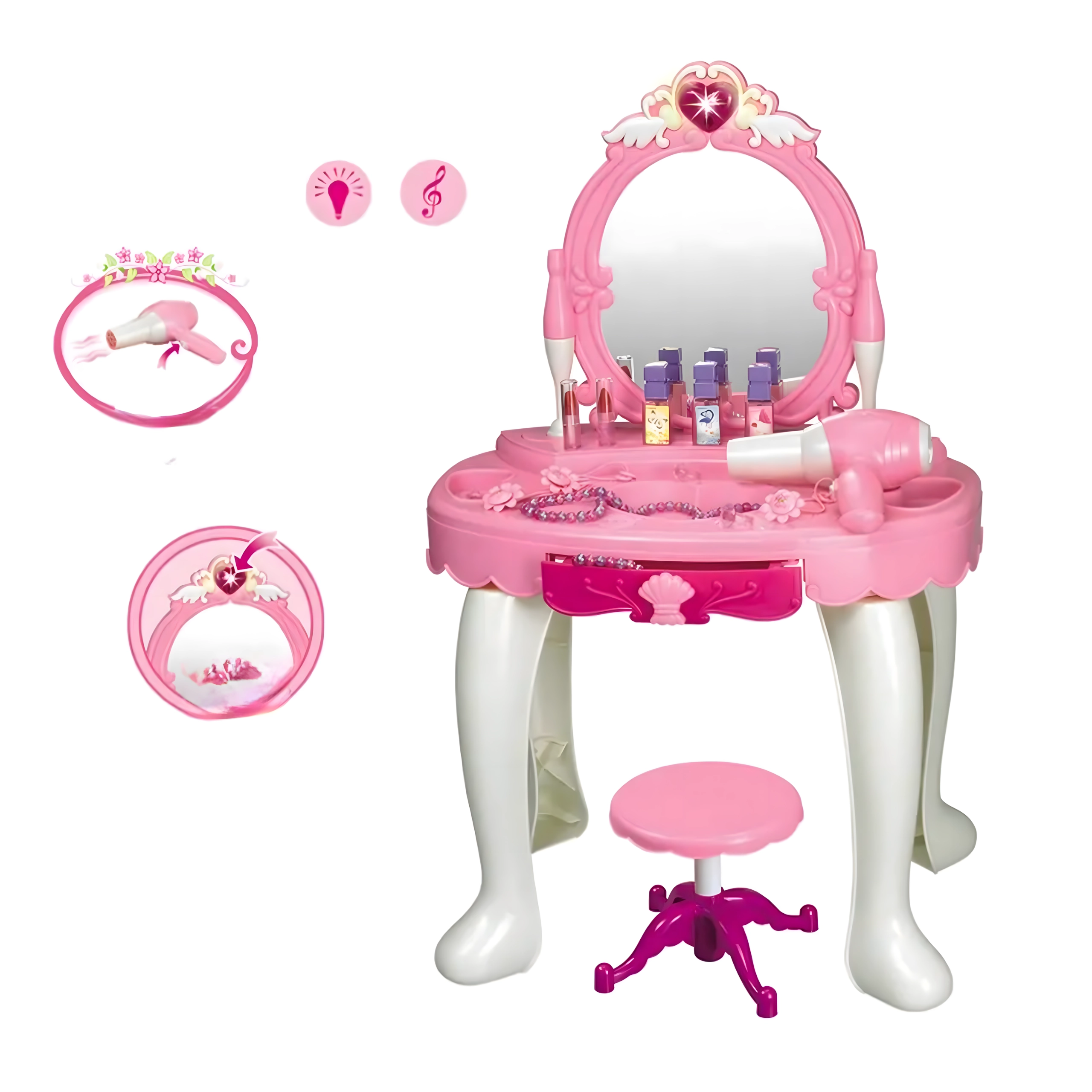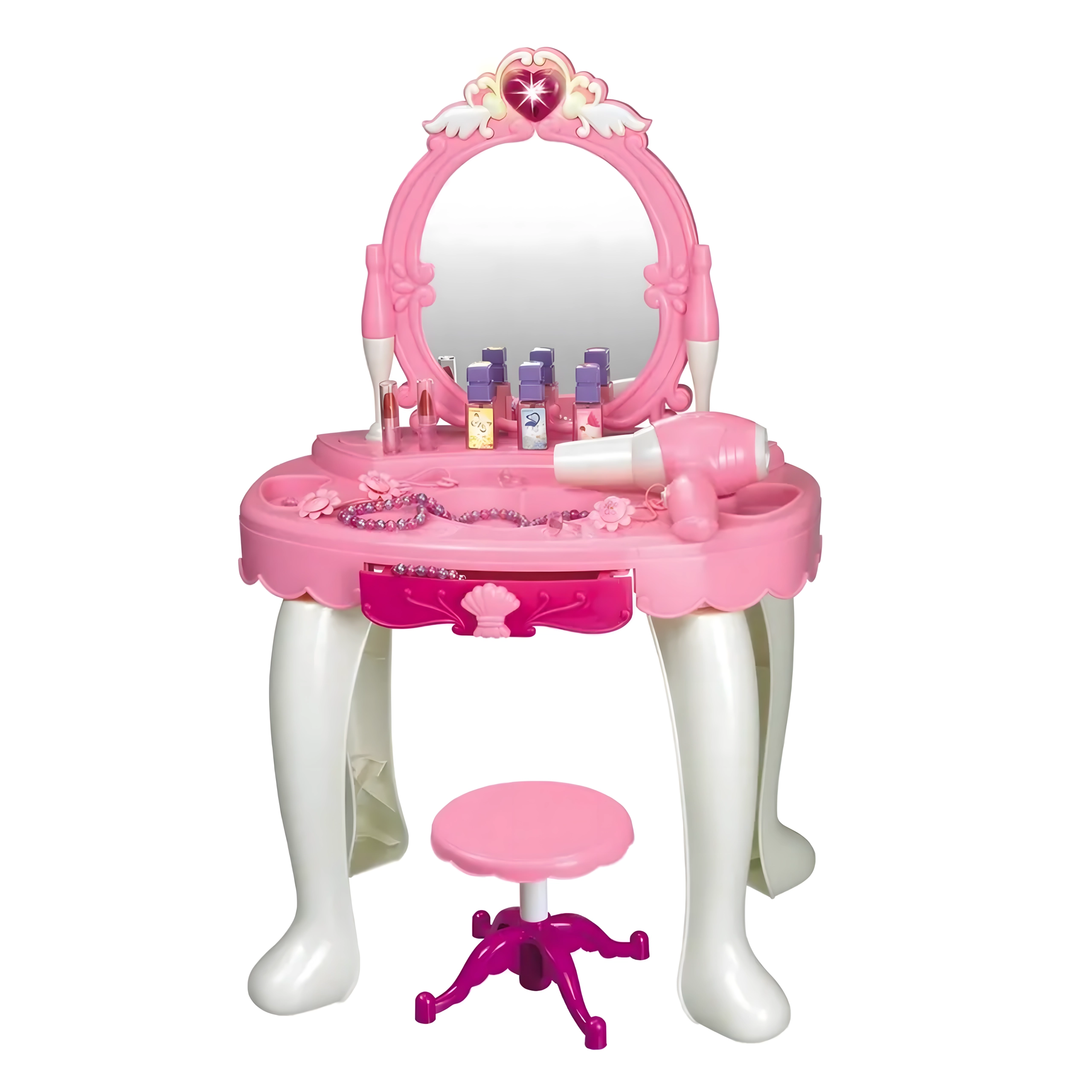 - Schminktisch mit Spiegel, Hocker, batteriebetriebener Spielzeugföhn, Kamm, Schmuck, Fläschchen, „Kosmetik“ und weiteres Zubehör
