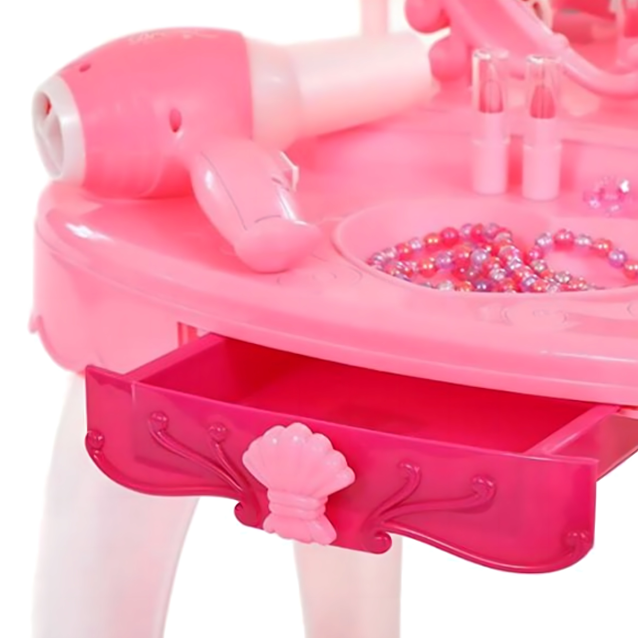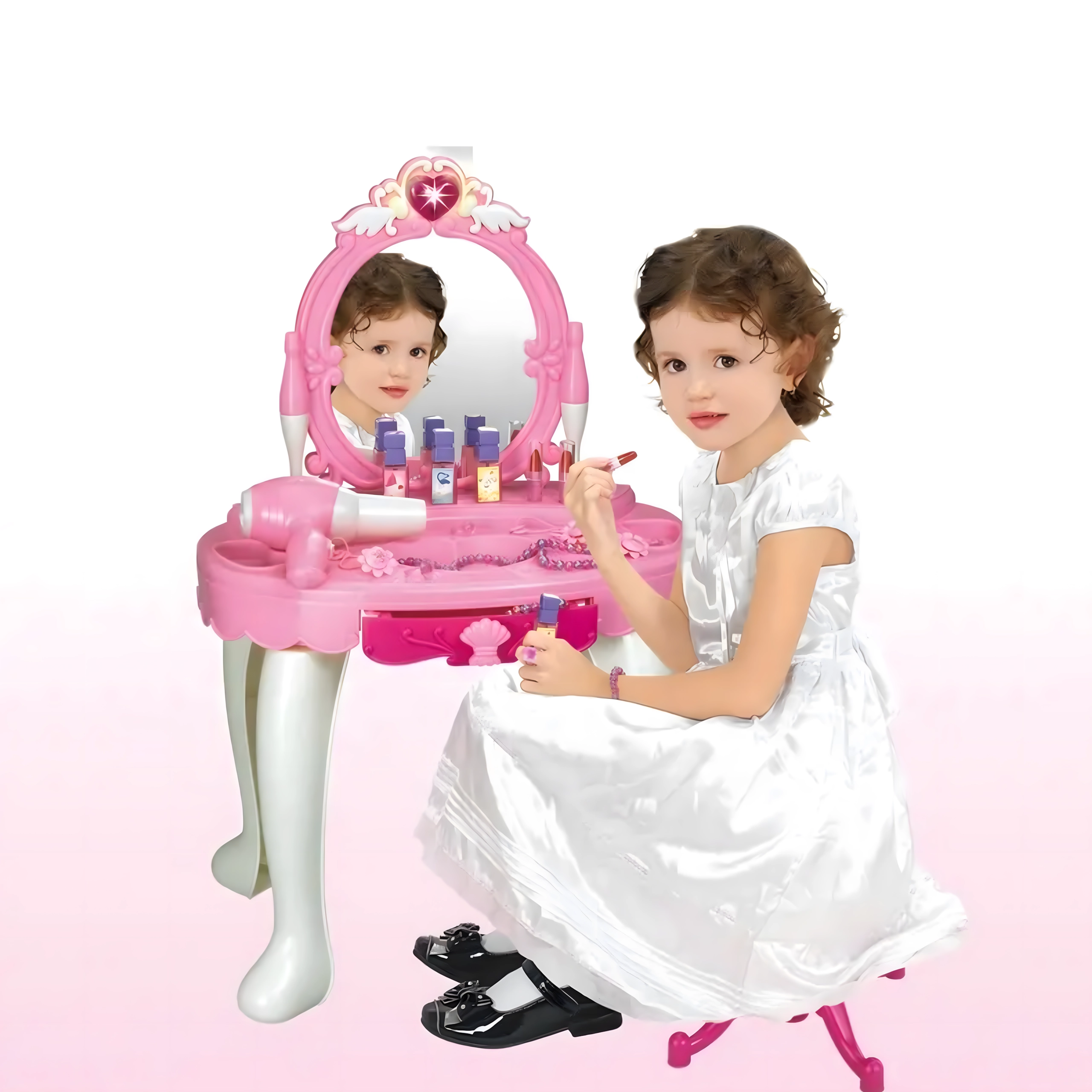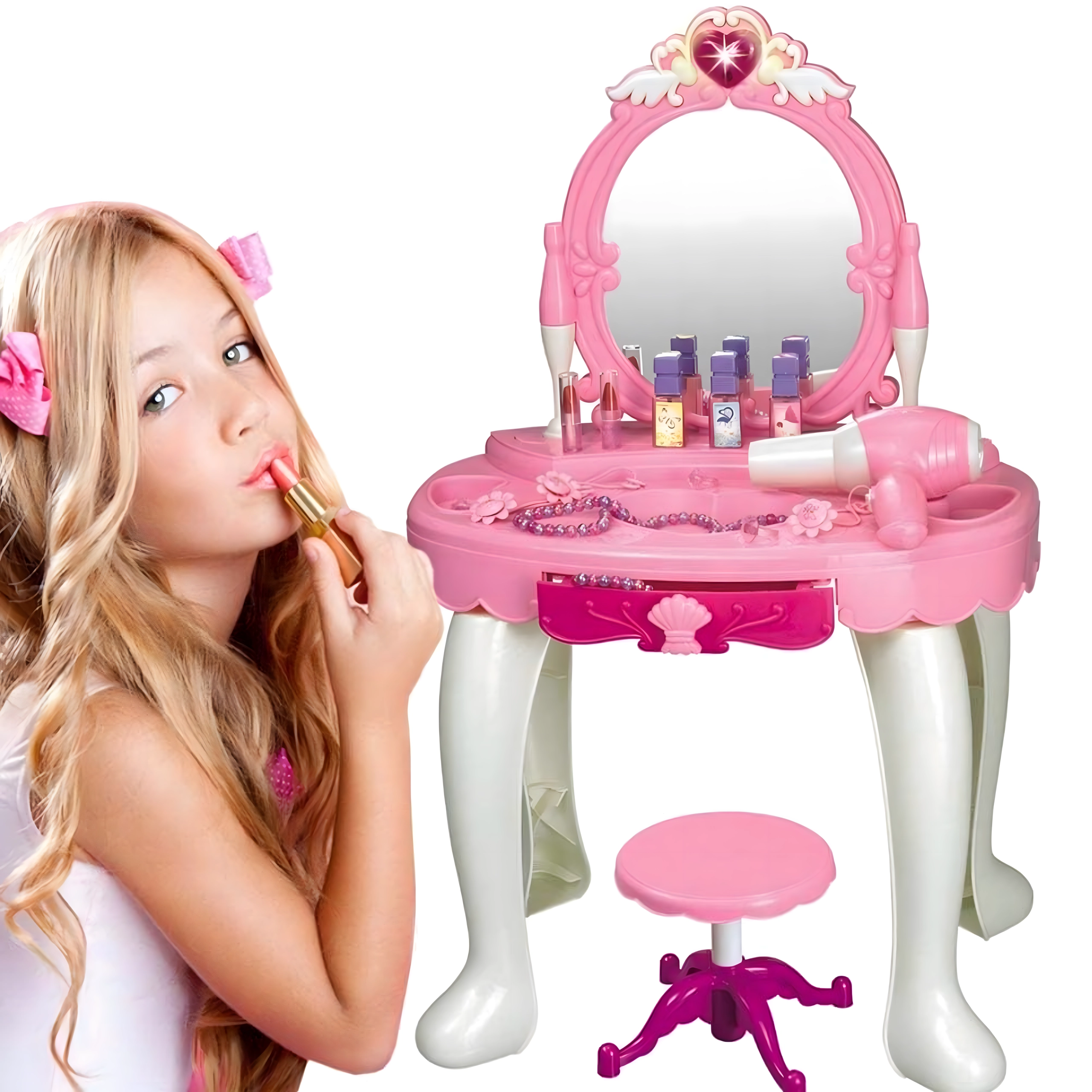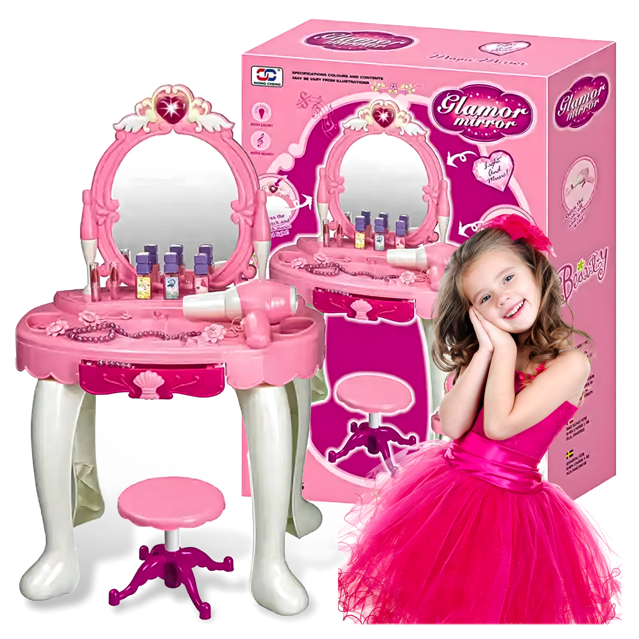- Schminktisch mit Spiegel, Hocker, batteriebetriebener Spielzeugföhn, Kamm, Schmuck, Fläschchen, „Kosmetik“ und weiteres Zubehör