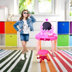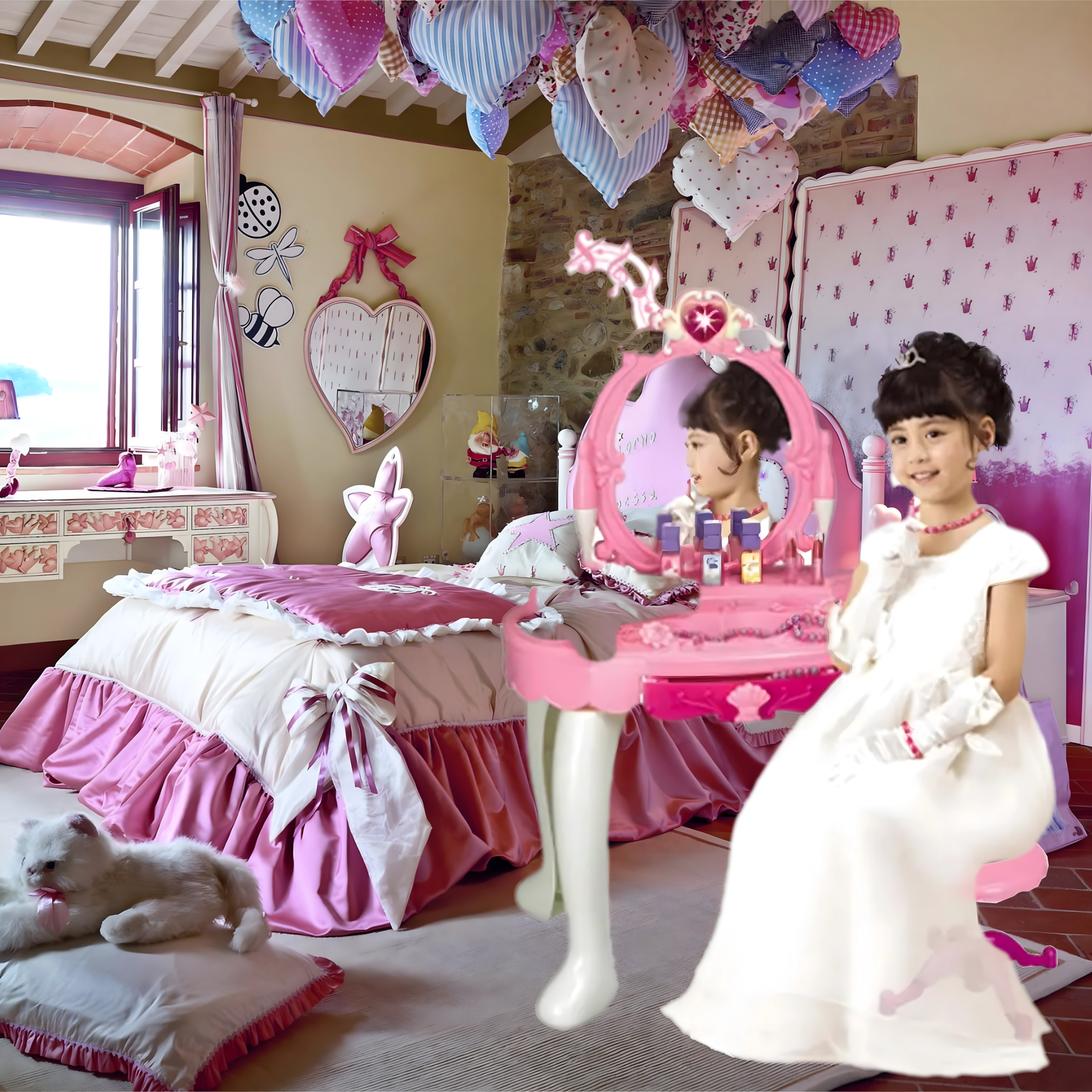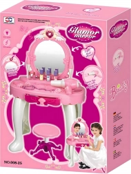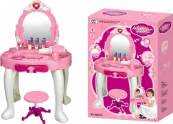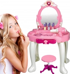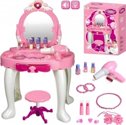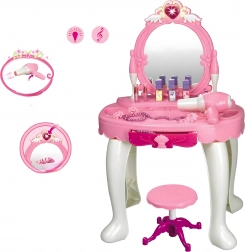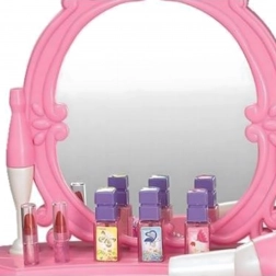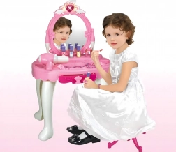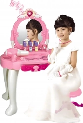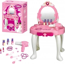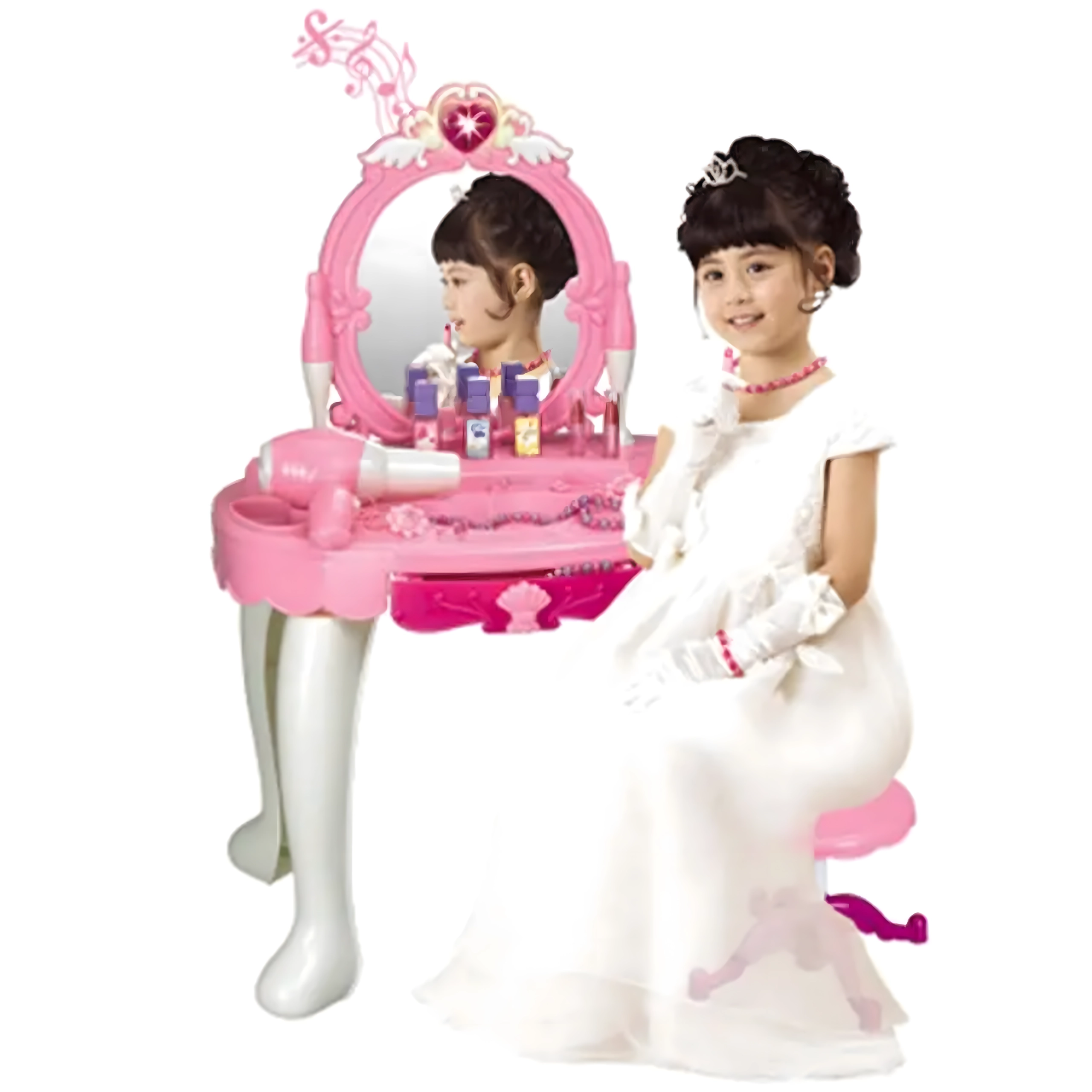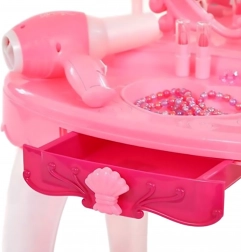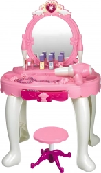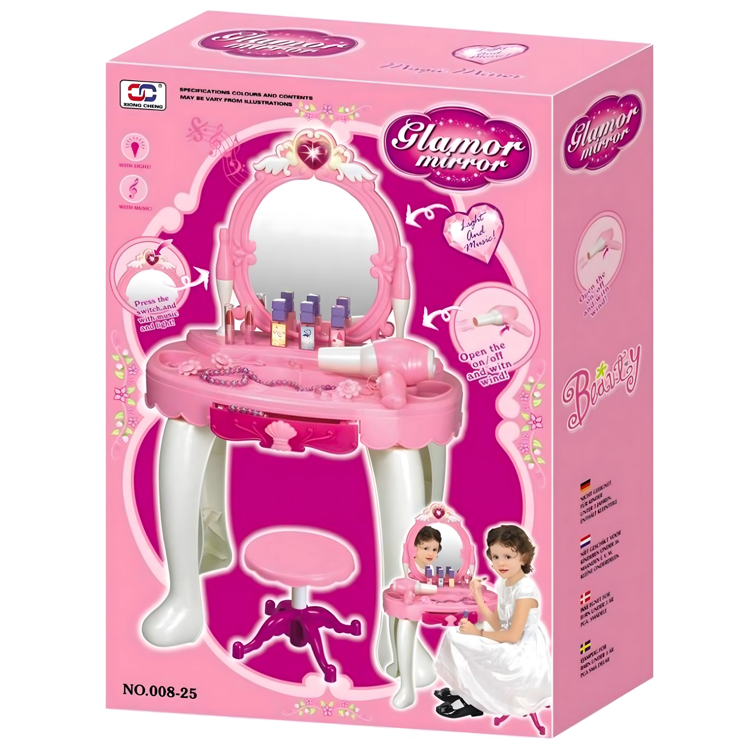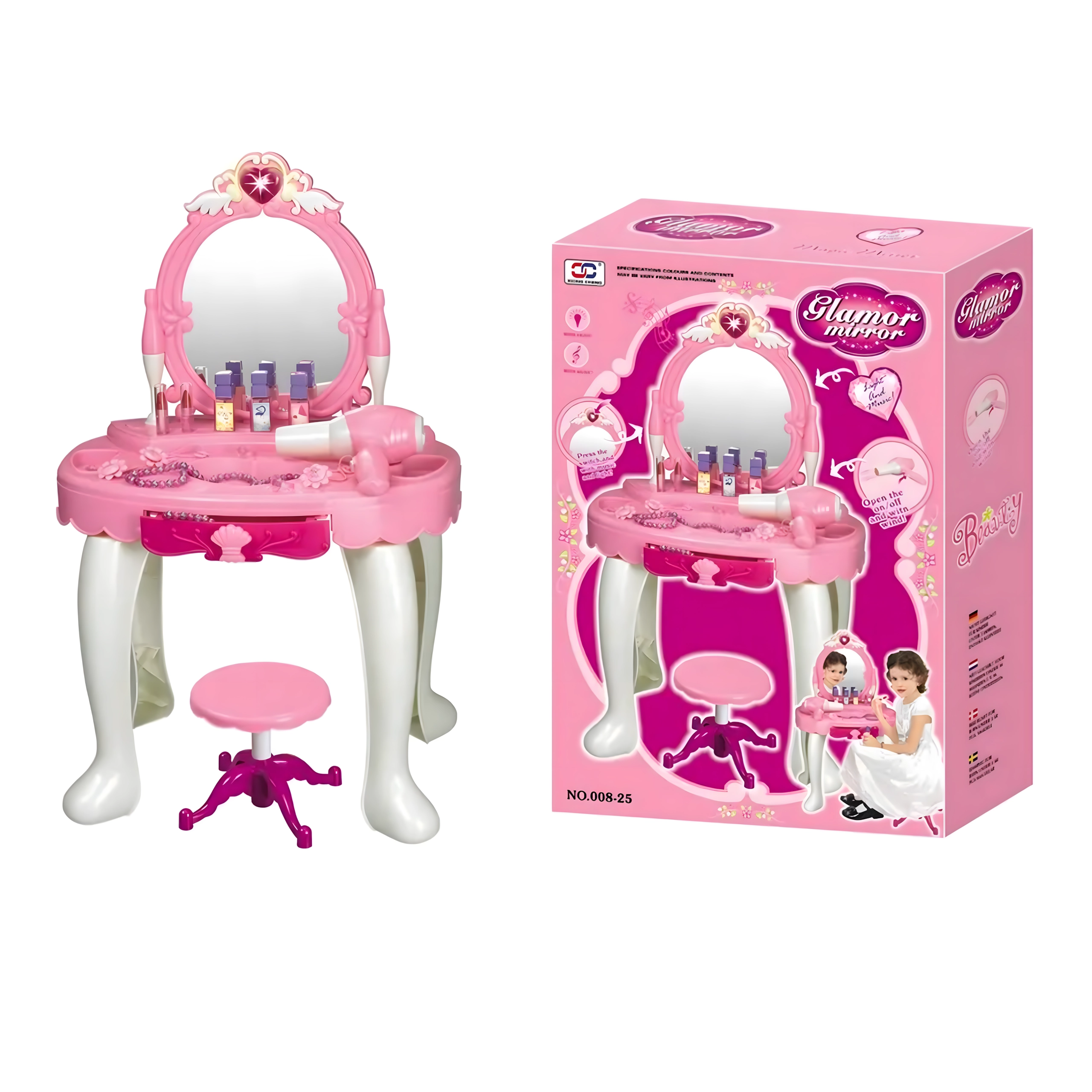 - Schminktisch mit Spiegel, Hocker, batteriebetriebener Spielzeugföhn, Kamm, Schmuck, Fläschchen, „Kosmetik“ und weiteres Zubehör