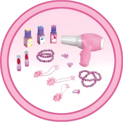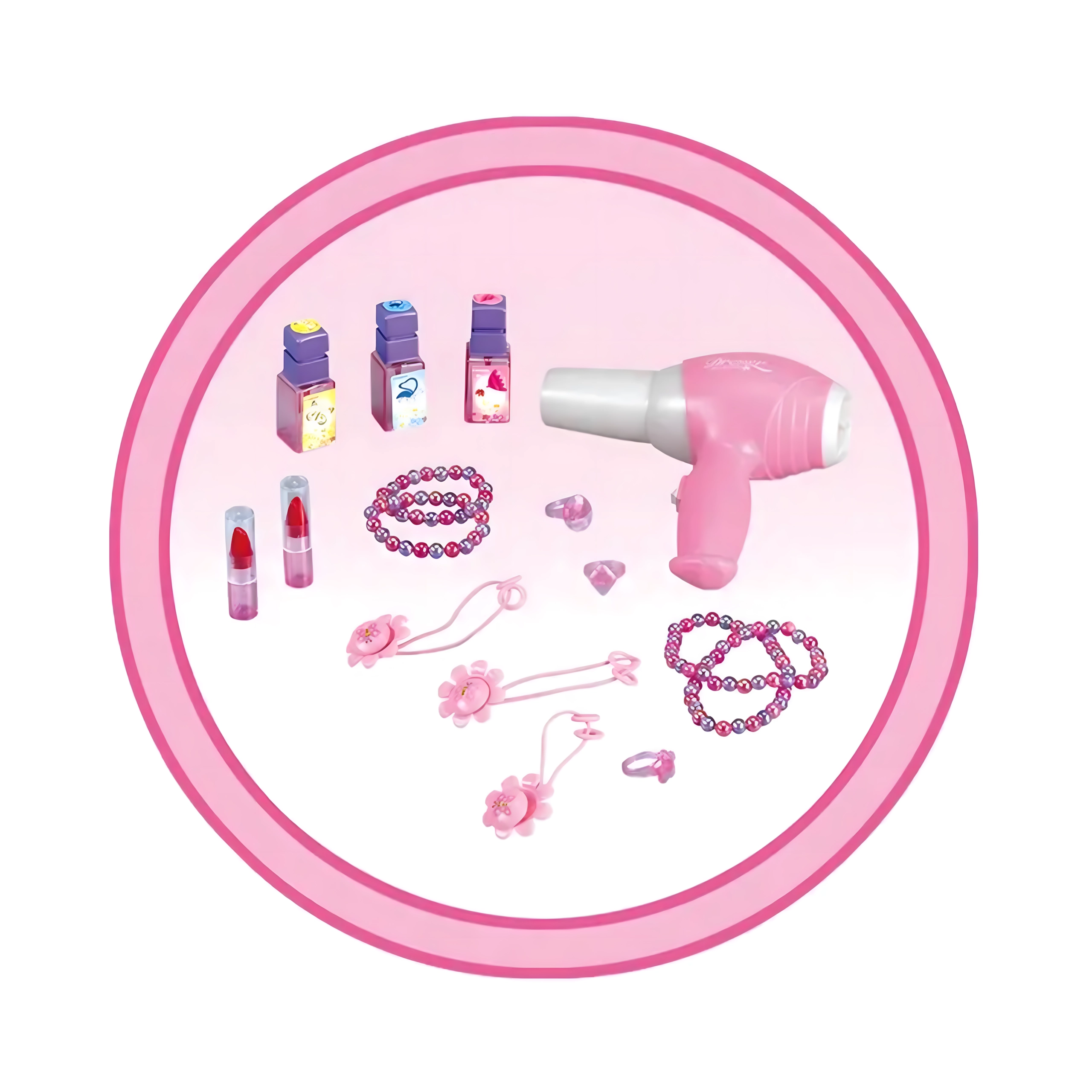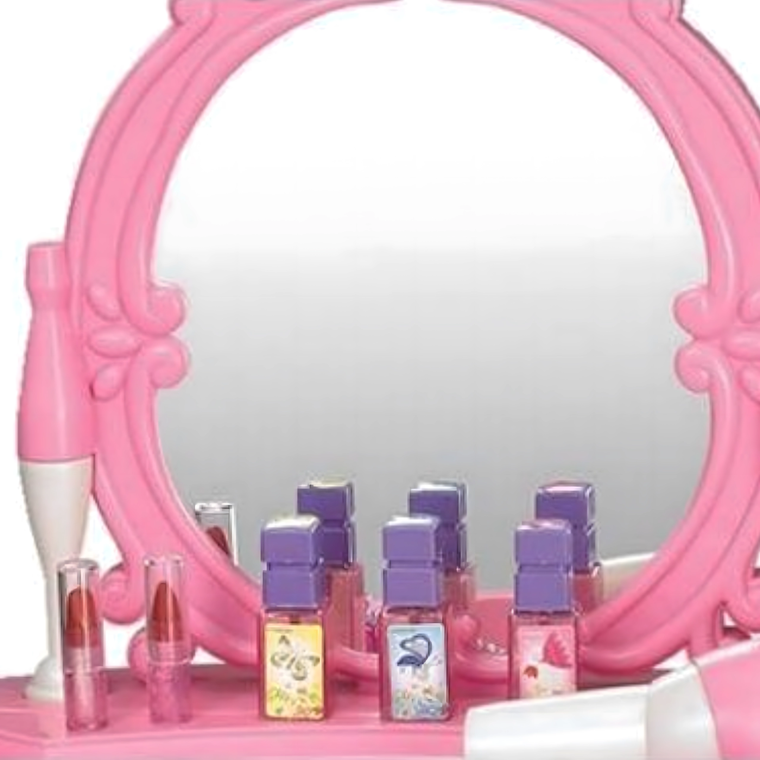 Dieser elegante Kinderschminktisch in Rosatönen bietet einen sicheren Spiegel, eine robuste Kunststoffkonstruktion und einen bequemen Hocker. Enthalten ist ein buntes Zubehör-Set – Kamm, Schmuck, „Parfums“, Lippenstifte und weitere kosmetische Requisiten – damit jedes Spiel im Schönheitssalon perfekt gelingt. Integrierte Effekte und der funktionale batteriebetriebene Spielzeugföhn sorgen für realistischen Spielspaß.