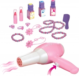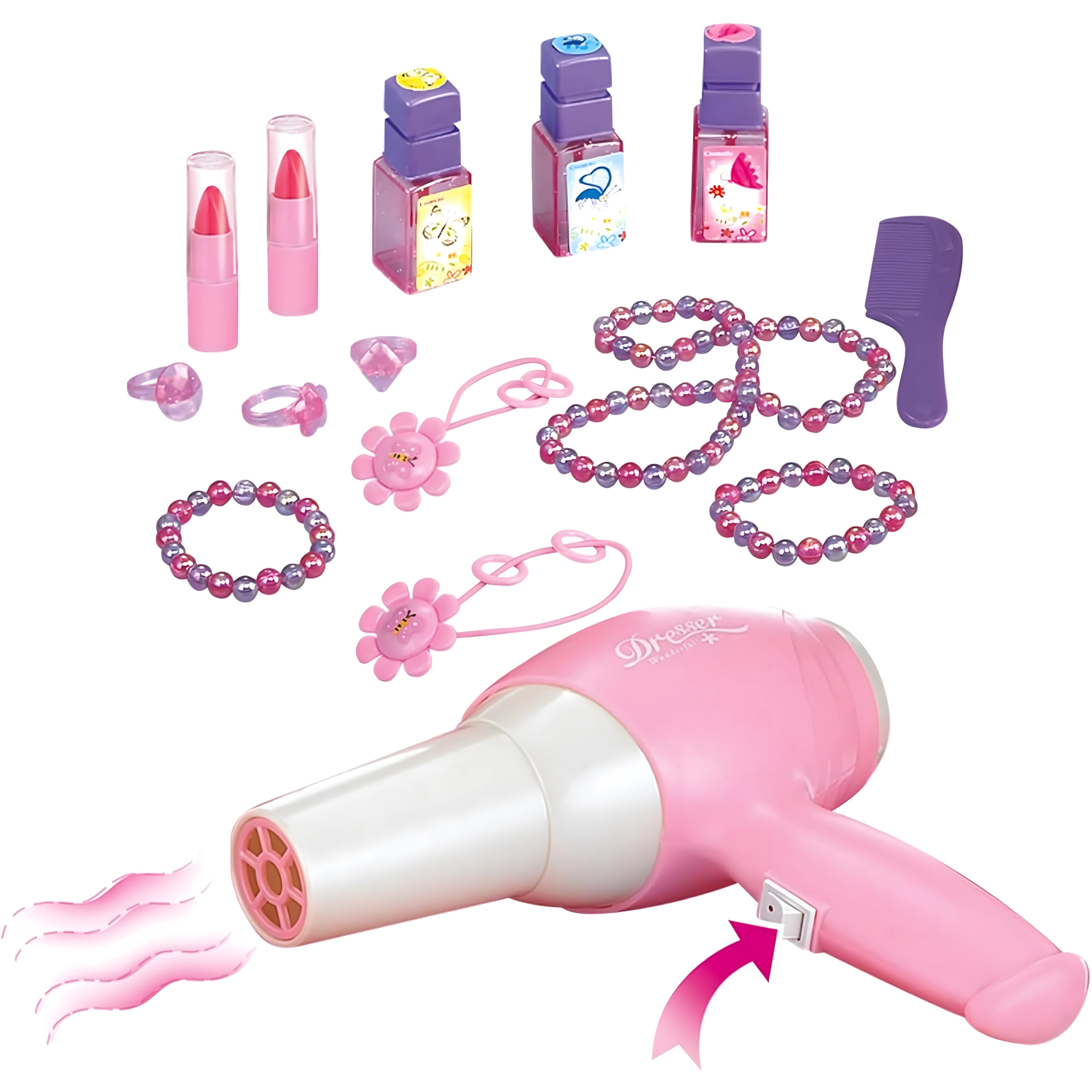Im Set enthalten ist ein batteriebetriebener Kinderföhn, der echtes Pusten imitiert – ein sicherer und unterhaltsamer Weg für realitätsnahes Friseurspiel.