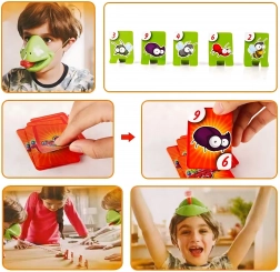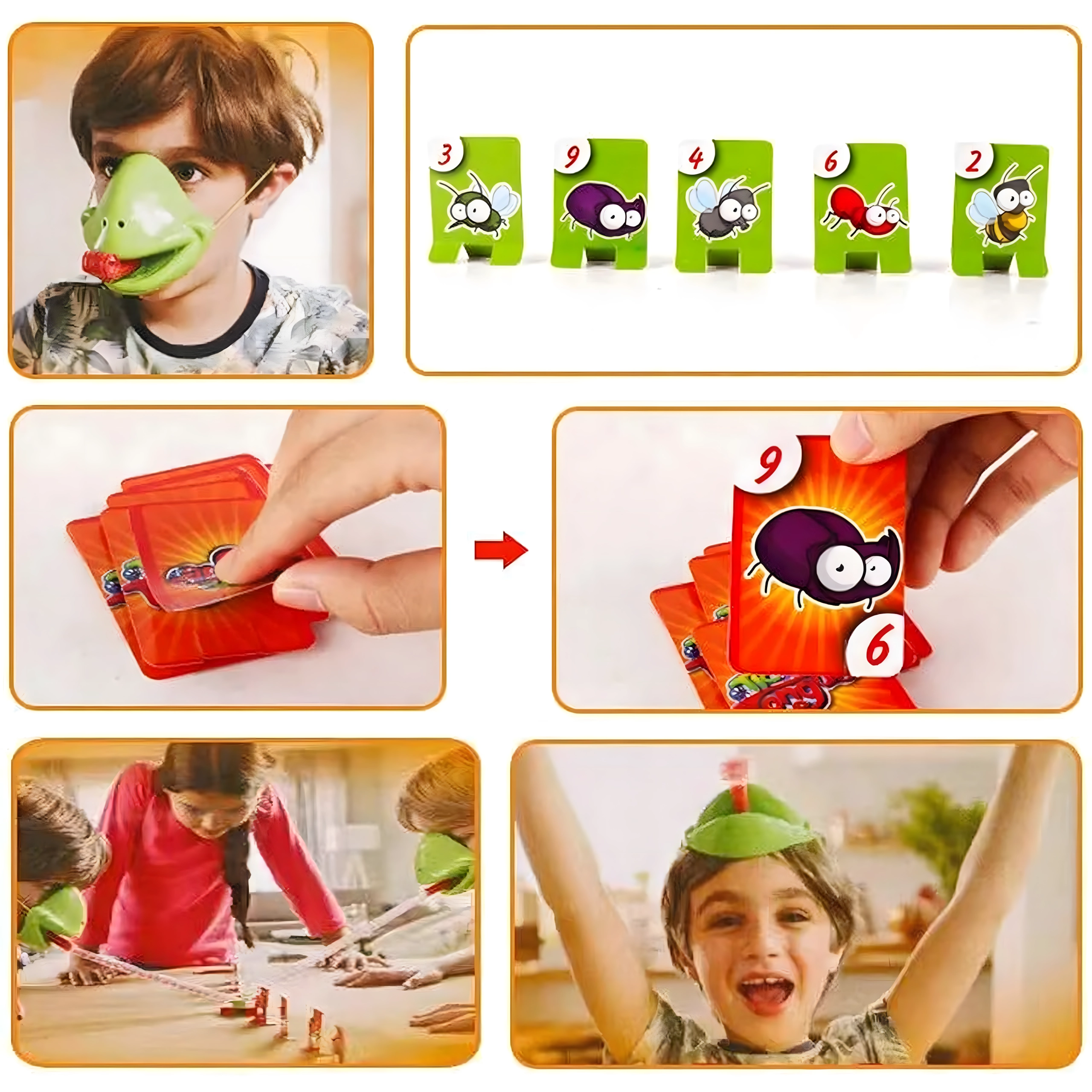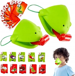 Verwandelt euch in Frösche und geht auf Käferjagd! Maske aufsetzen, zielen und mit der Zunge auf die Zielkarten schießen – wer das richtige Bild oder die richtige Zahl am schnellsten erwischt, sammelt Punkte. Das Spiel ist leicht zu verstehen, in wenigen Augenblicken startklar und begeistert kleine wie große Spieler.