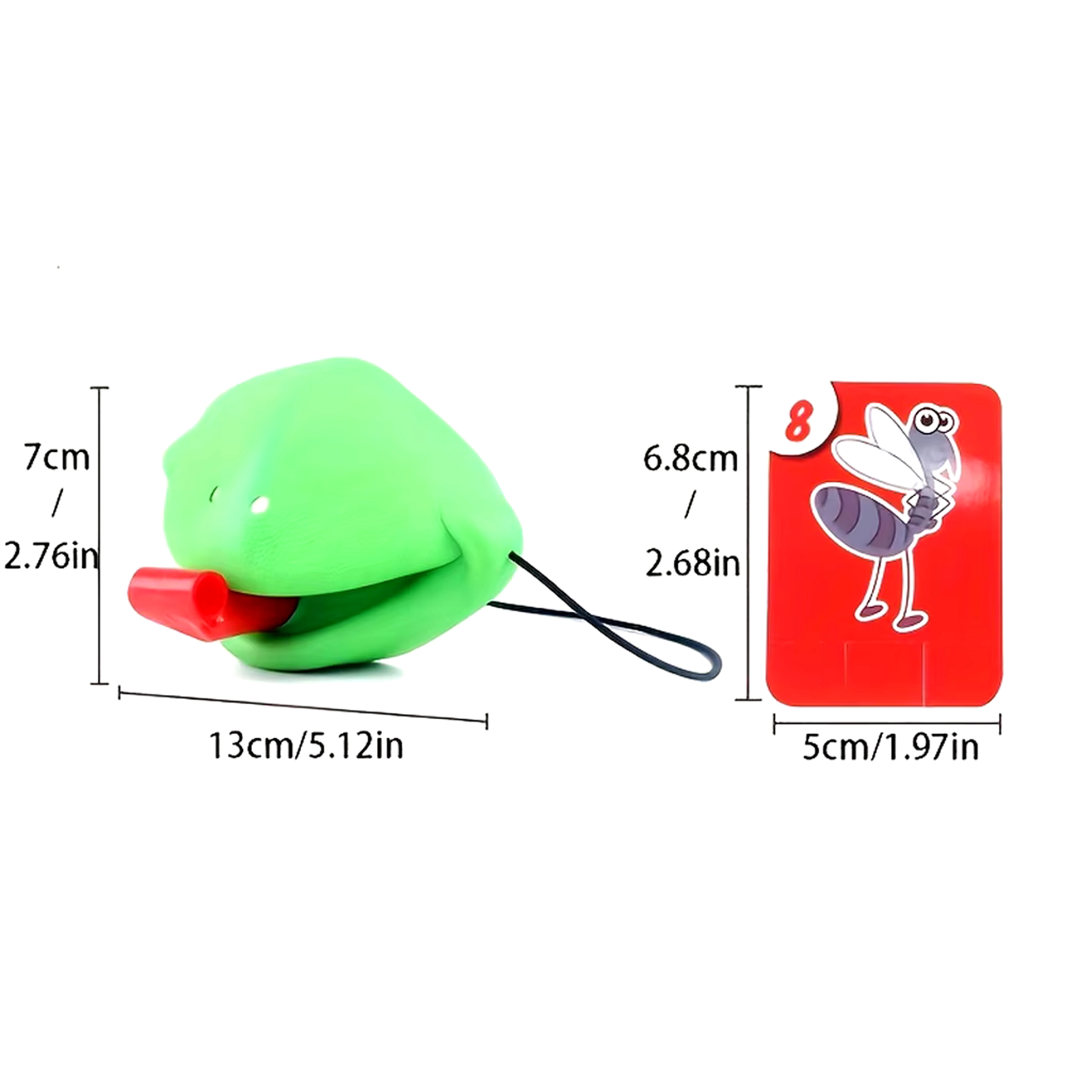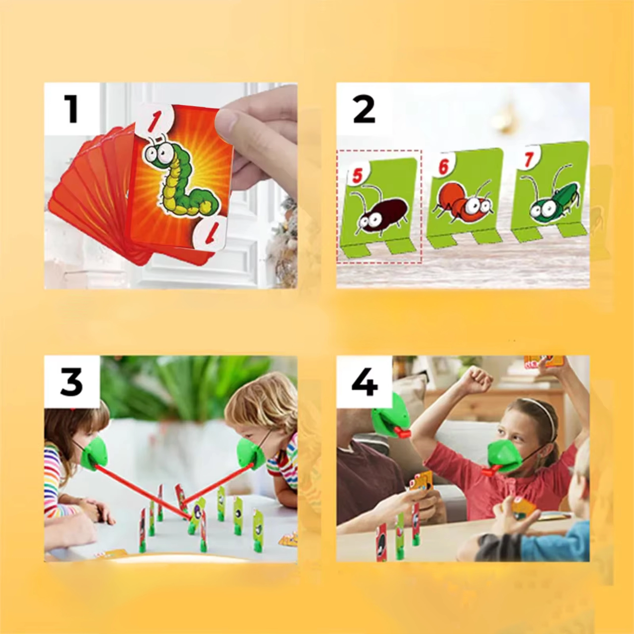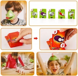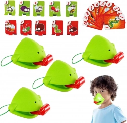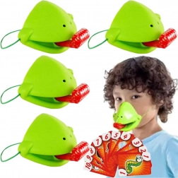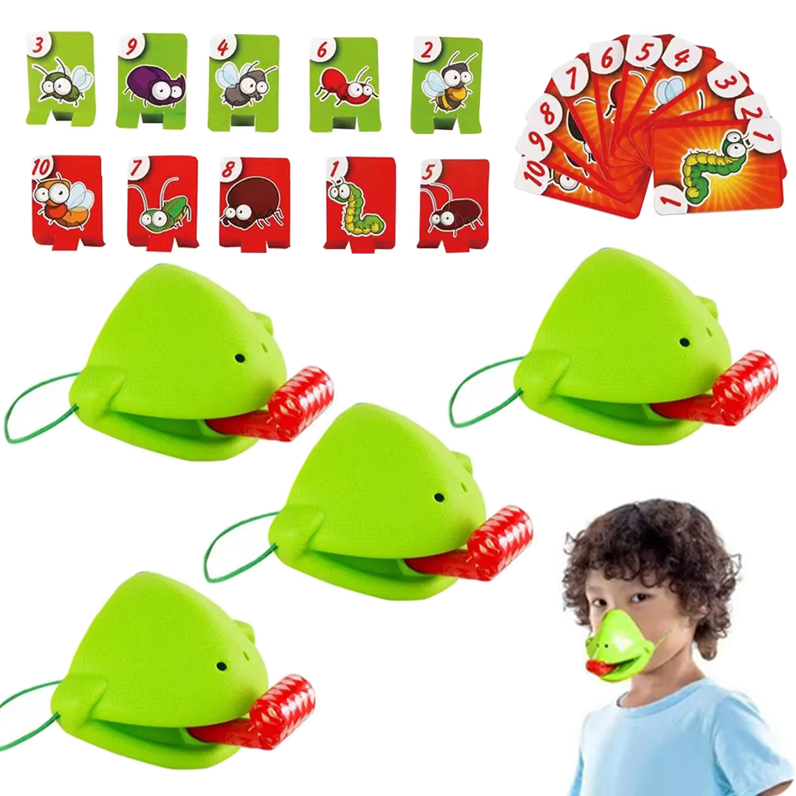 Das Set enthält alles für 4 Spieler: leichte Froschmasken mit elastischem Band und „Zunge“ sowie bunte Kärtchen. Das Spiel fördert schnelle Reaktionen, die Hand-Auge-Koordination und die Konzentration. Ideal für Familienabende, Kindergeburtstage und freie Momente zu Hause.
