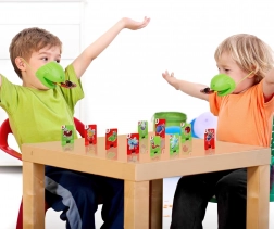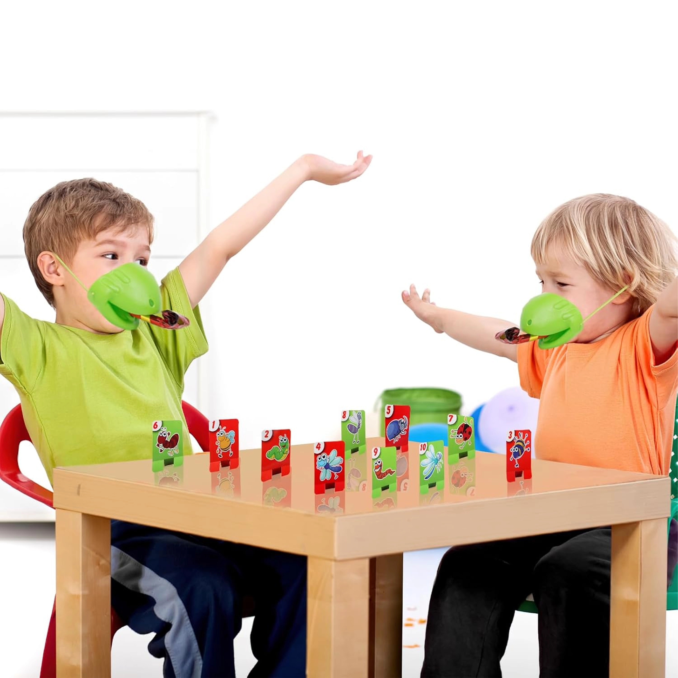 Leichte Masken mit elastischem Band und „abschießbarer“ Zunge machen jeden Kampf um die Kärtchen zur unvergesslichen Show für die ganze Familie.