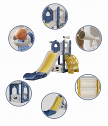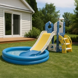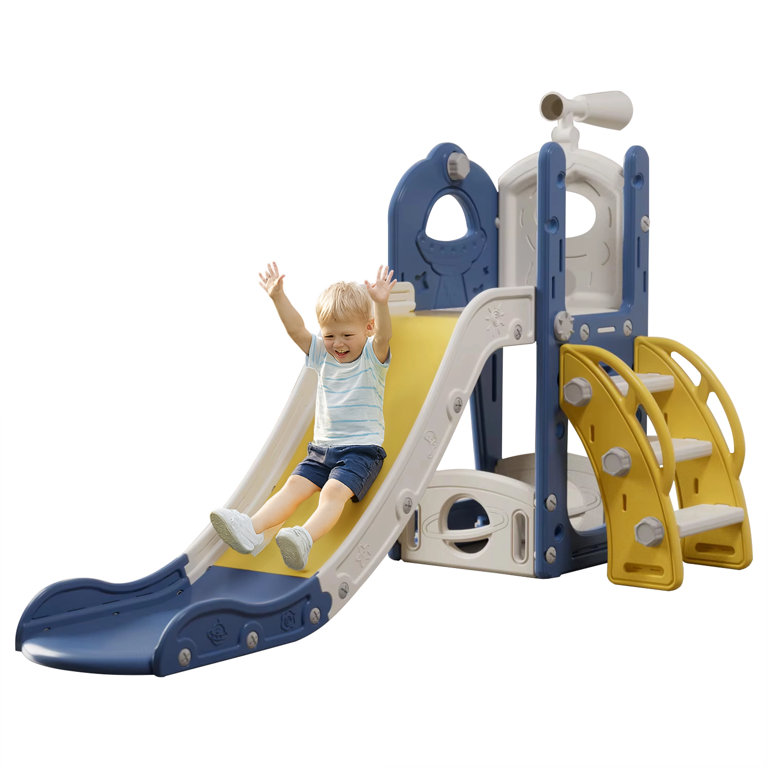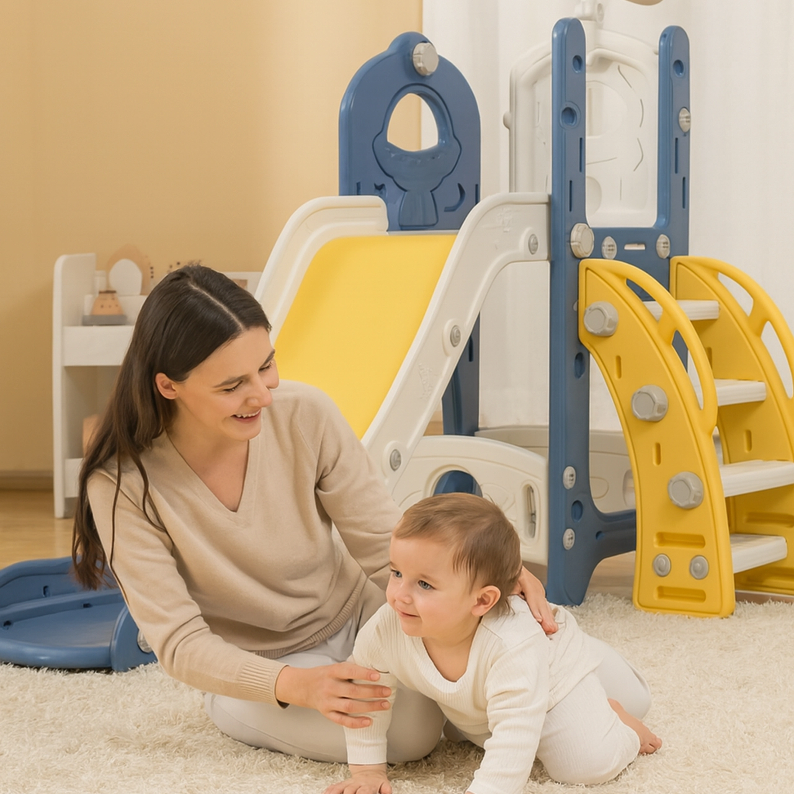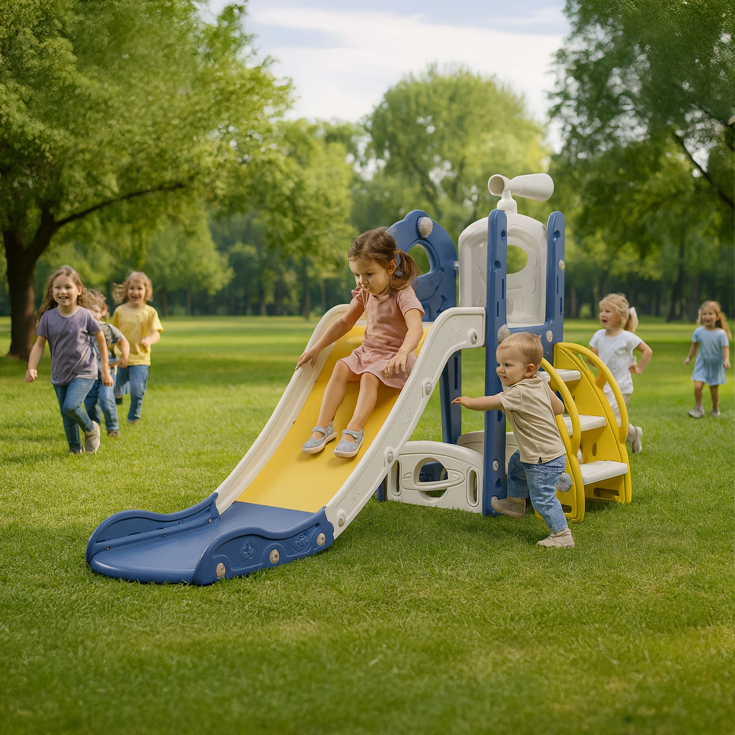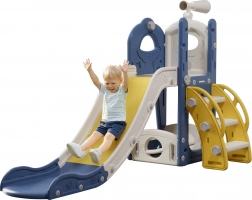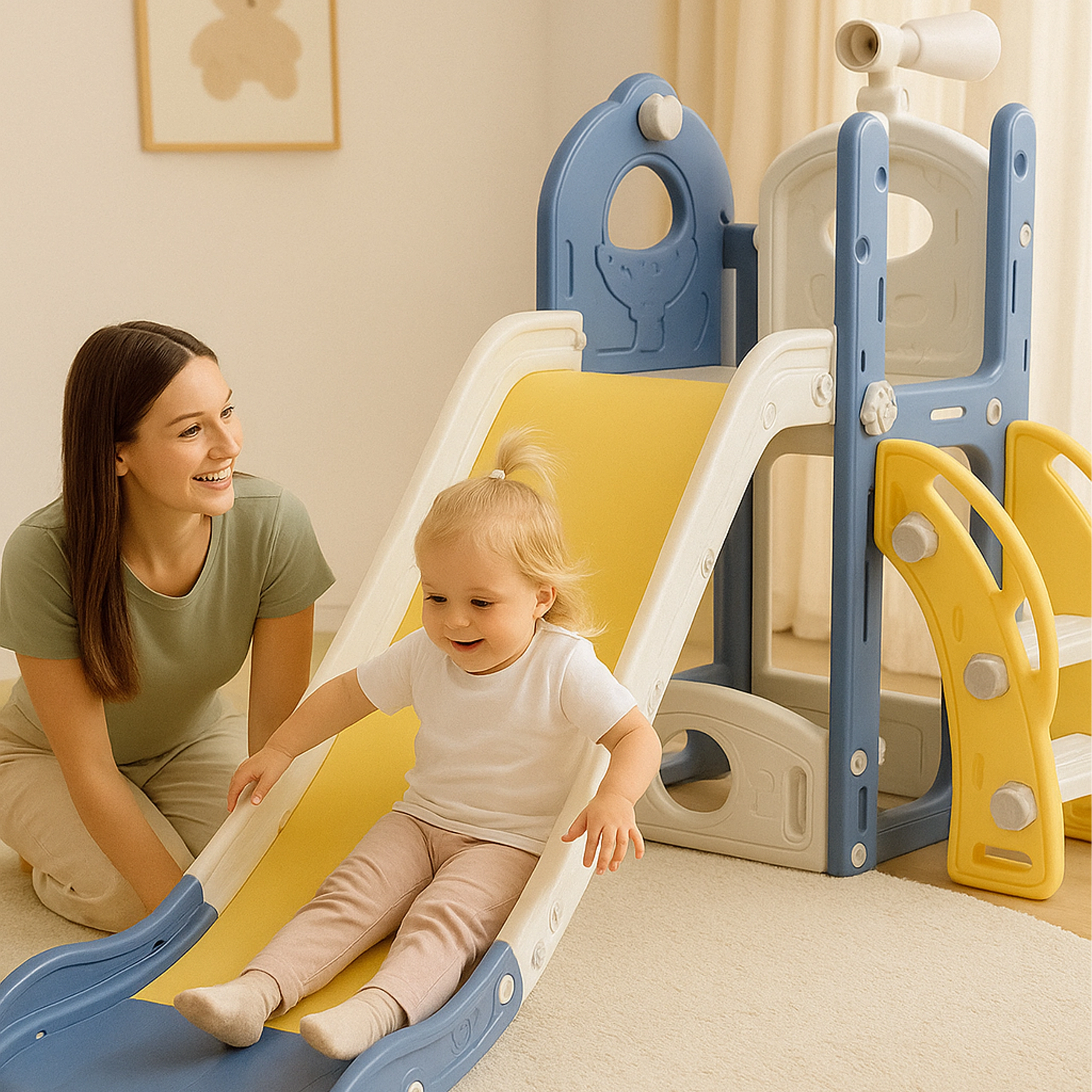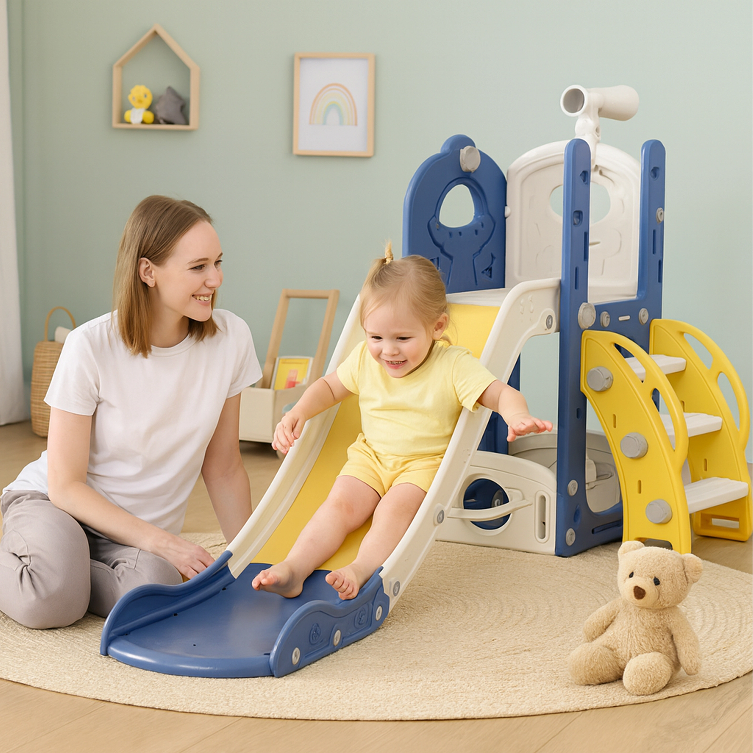 Zum Set gehören unterhaltsame Extras – ein Basketballkorb für die ersten Treffer und ein Teleskop für kleine Entdecker. Die Rutsche ist pflegeleicht, für den täglichen Gebrauch geeignet und lässt sich dank kompakter Maße im Wohnzimmer, Kinderzimmer oder auf der Terrasse platzieren. Sie eignet sich auch hervorragend für ein Bällebad.
