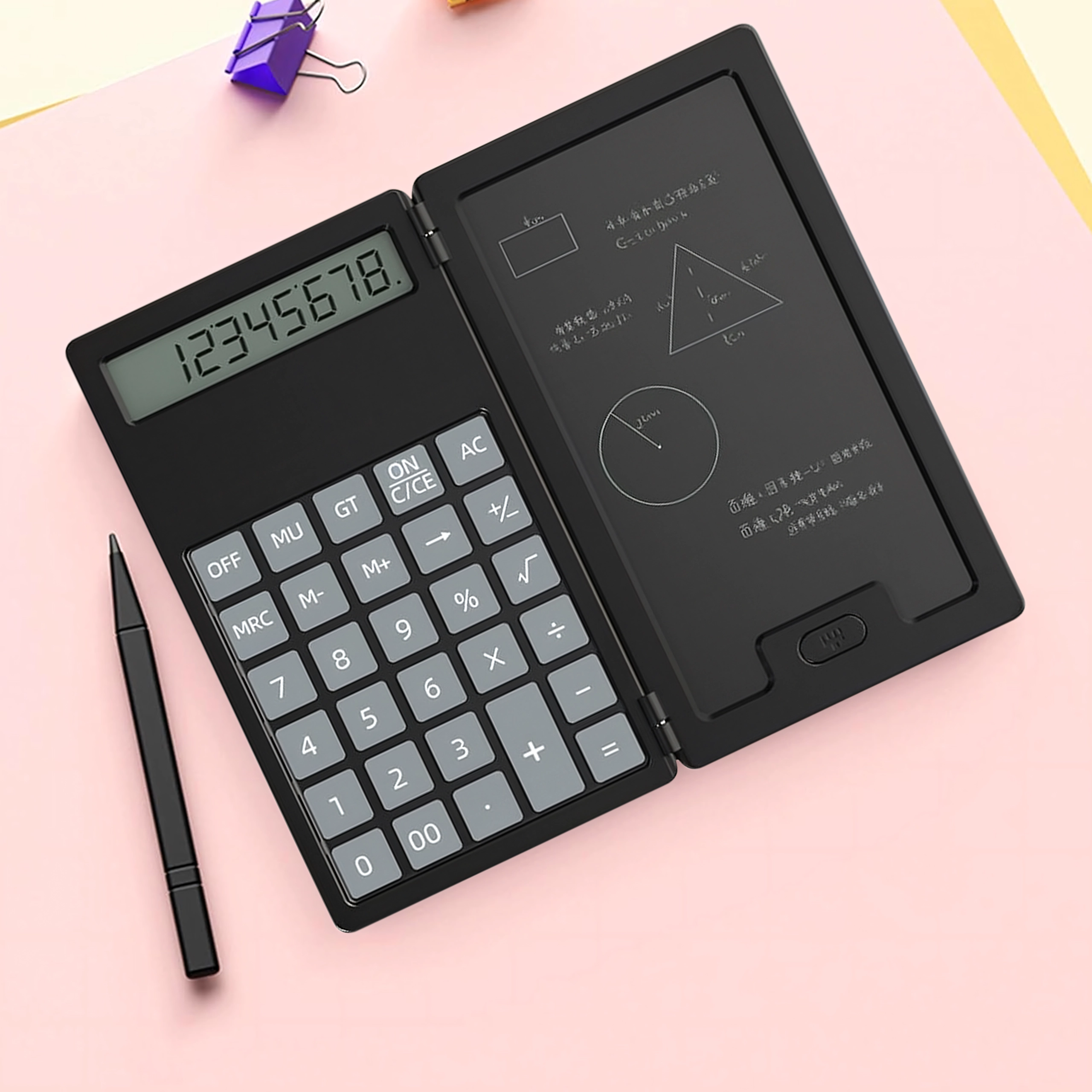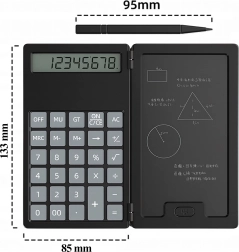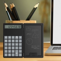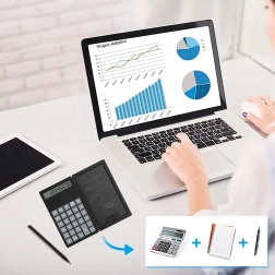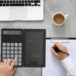 Dieser smarte Rechner mit klappbarem Gehäuse kombiniert klassisches Rechnen mit einer praktischen LCD-Schreibtafel für Notizen. Dank des leichten und schlanken Designs passt er problemlos in Tasche oder Hosentasche – so haben Sie ihn stets griffbereit für schnelle Berechnungen und Notizen.