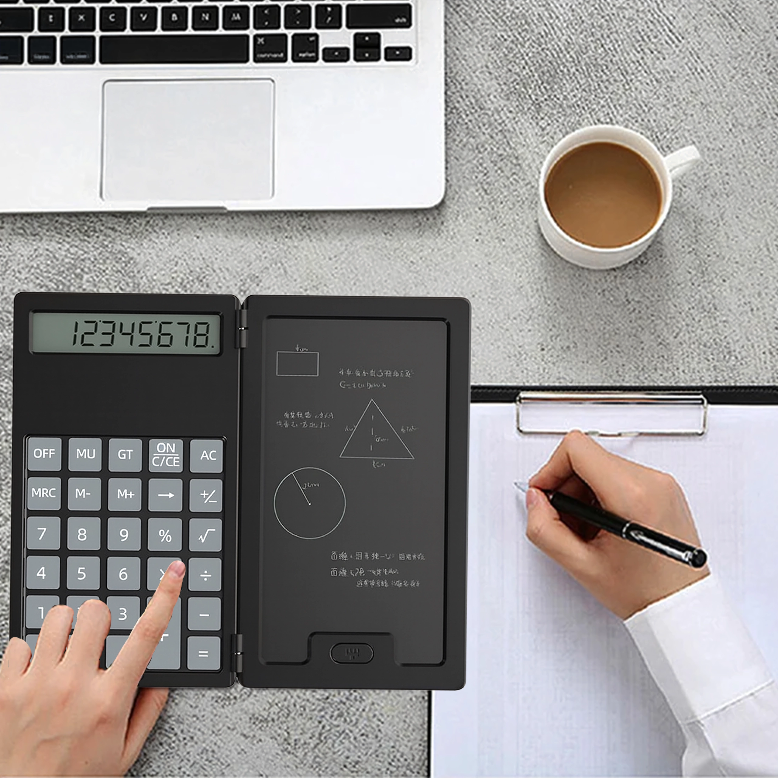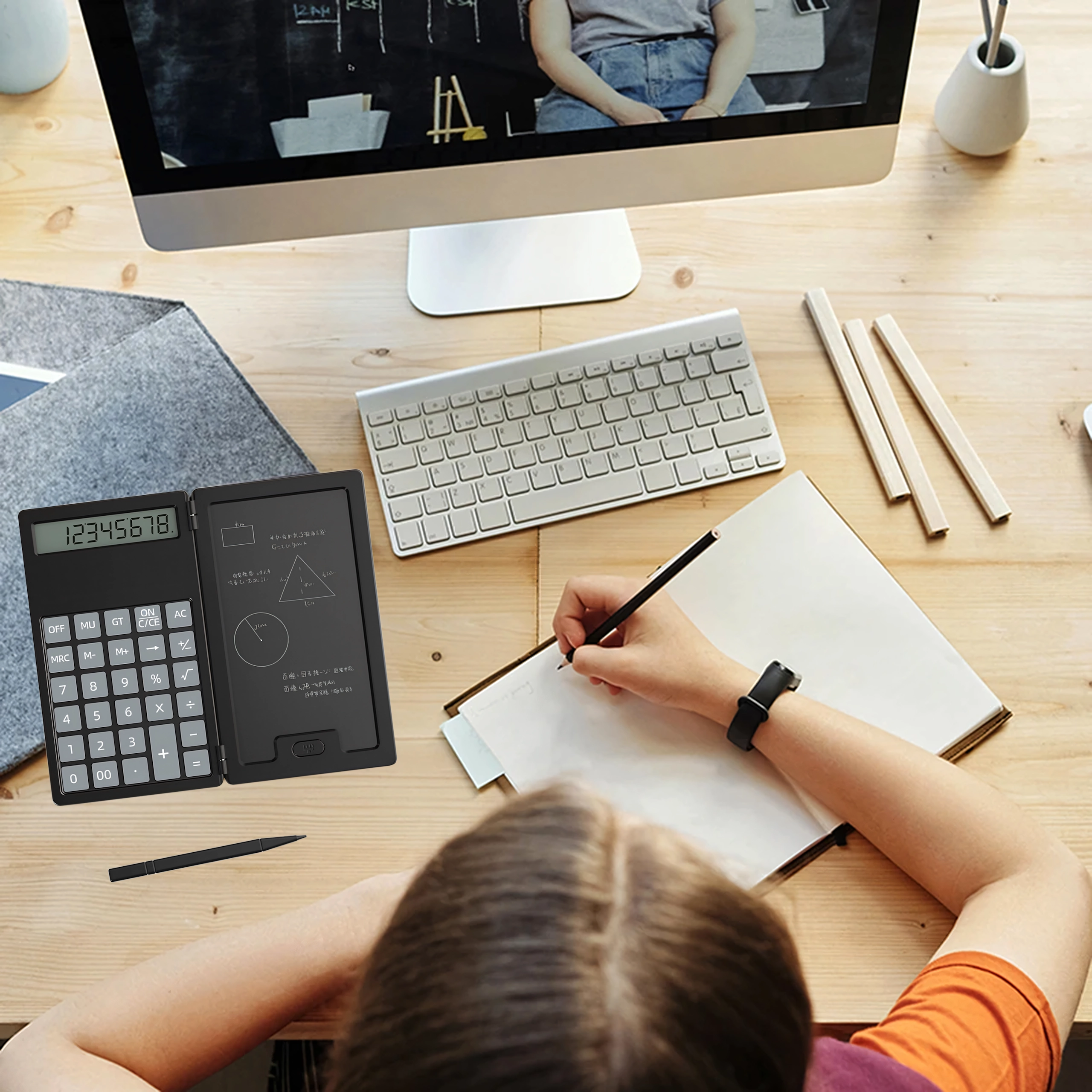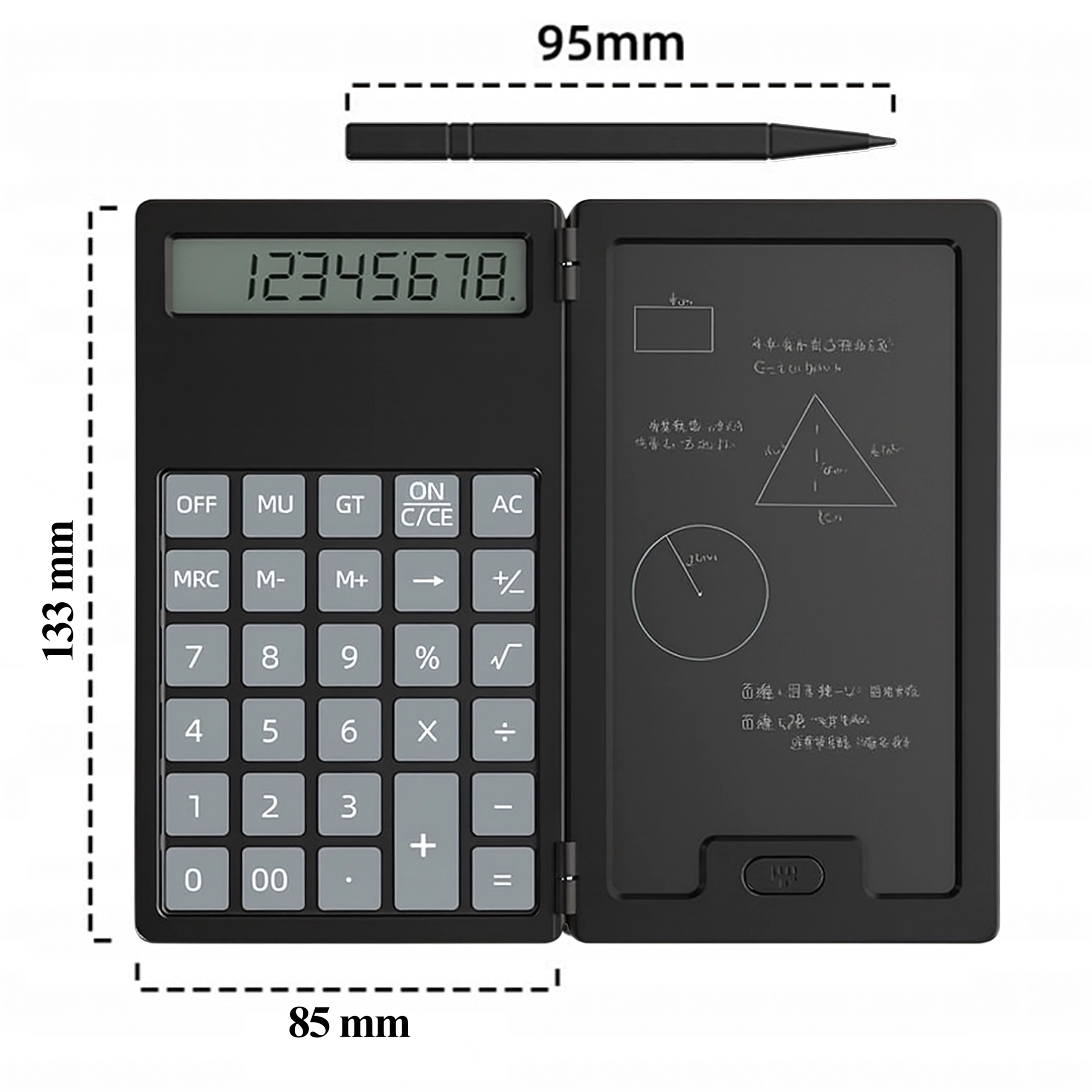 Links ein präziser Taschenrechner, rechts eine LCD-Fläche für schnelle Notizen – ideal für Berechnungen, Formeln und Skizzen ganz ohne Papier.