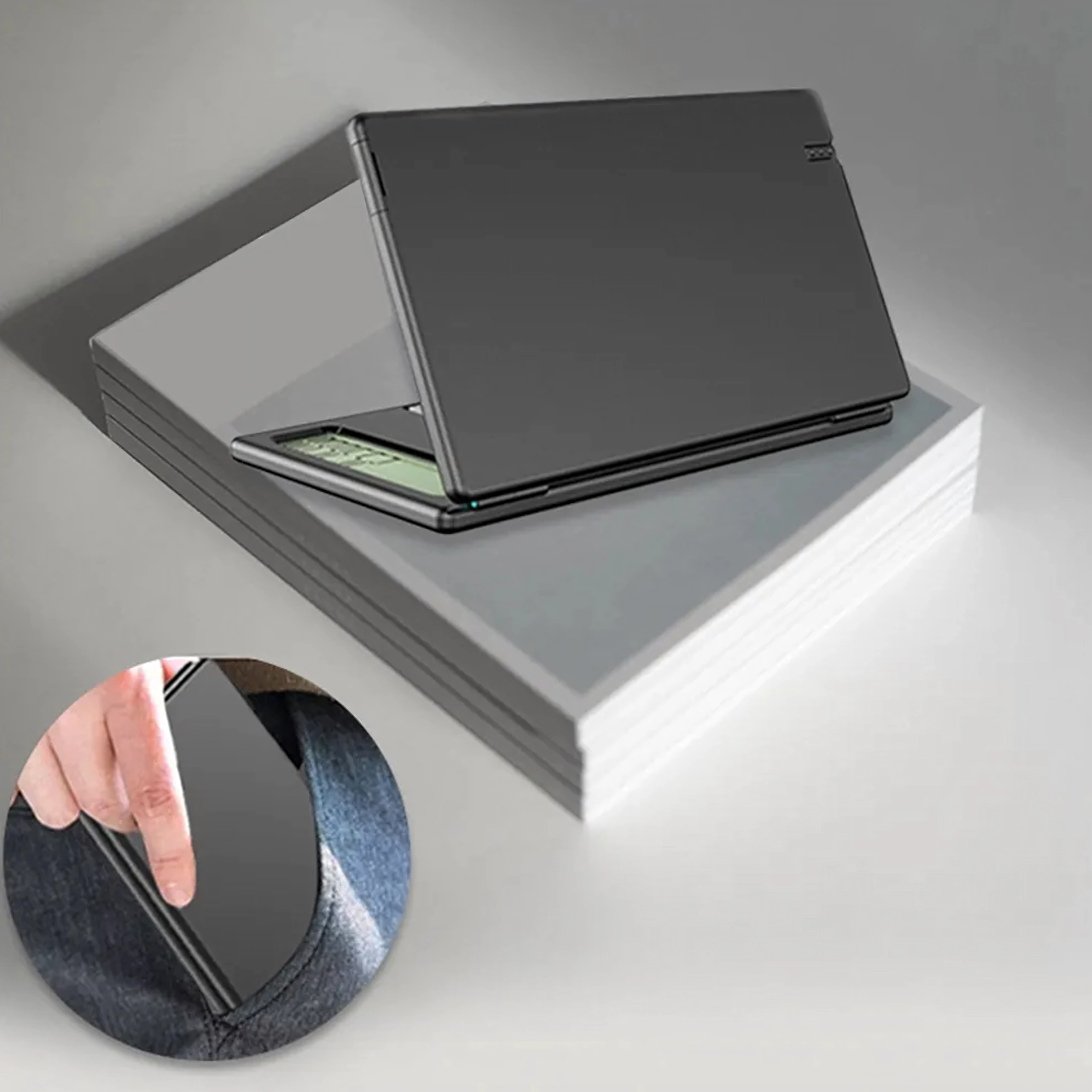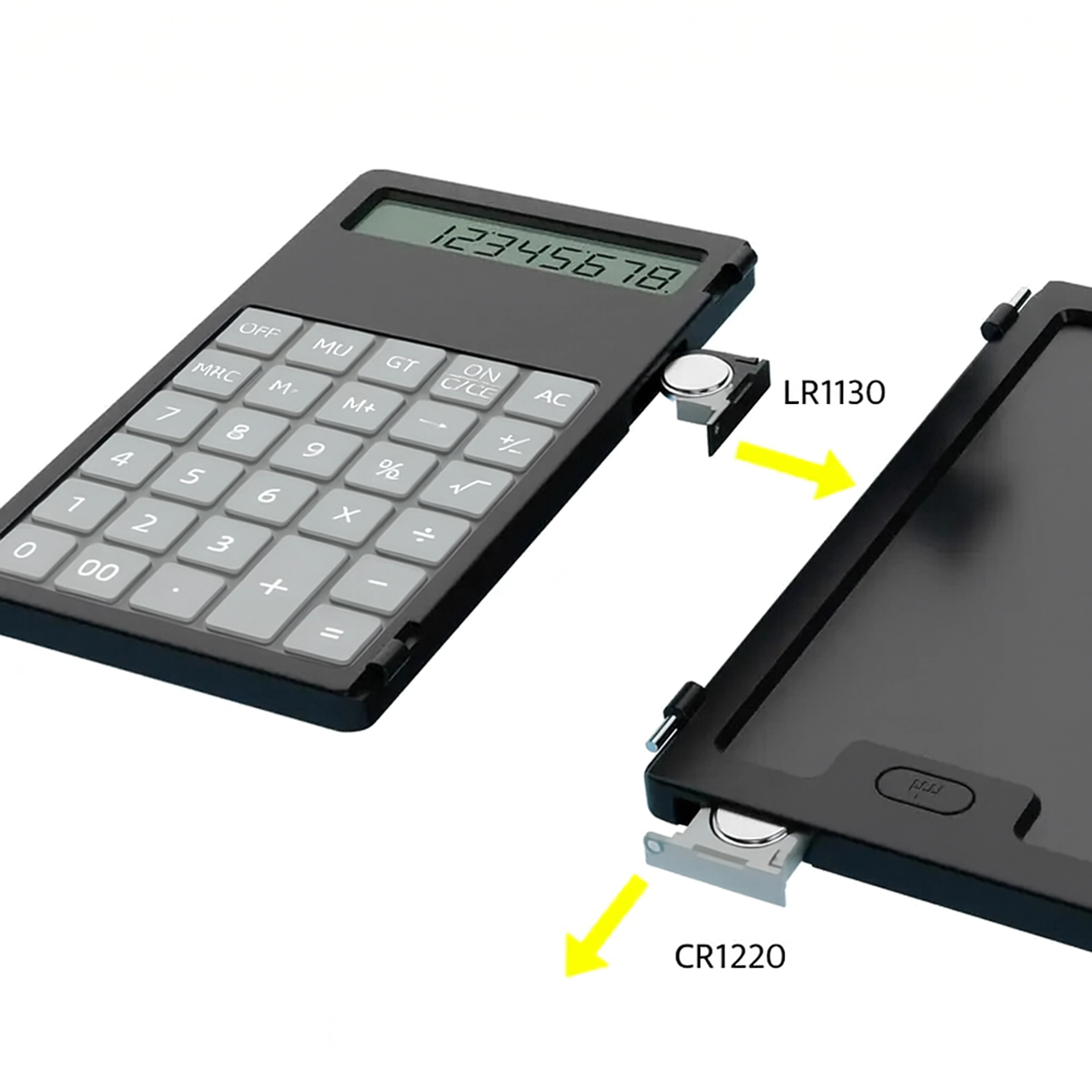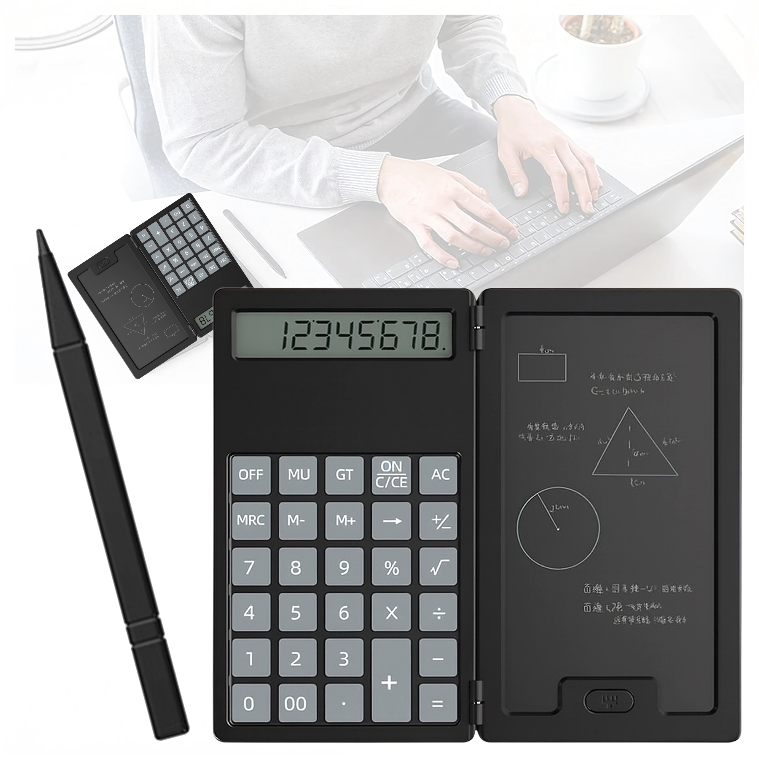 Links ein präziser Taschenrechner, rechts eine LCD-Fläche für schnelle Notizen – ideal für Berechnungen, Formeln und Skizzen ganz ohne Papier.
