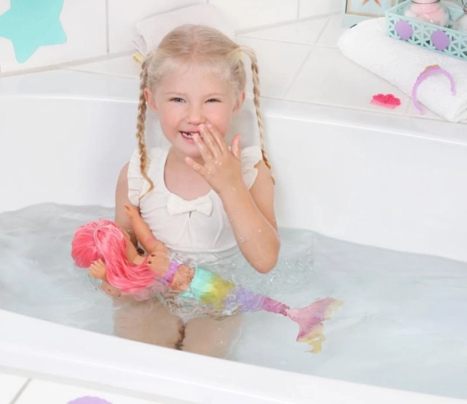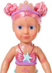 BABY born Little Meerjungfrau Prinzessin ist eine unwiderstehliche Puppe mit langen rosa Haaren, die mit einem lila Haarband verziert sind. Die Flosse der Puppe ist wunderschön bunt, glitzernd und bewegt sich bei Kontakt mit Wasser, was eine magische Atmosphäre schafft. Sie trägt einen Badeanzug mit Muscheldesign, der perfekt zur Schwanzflosse passt.