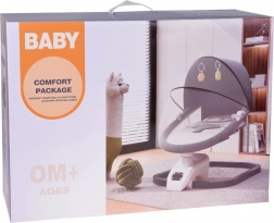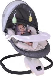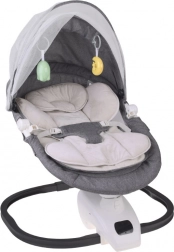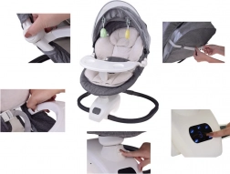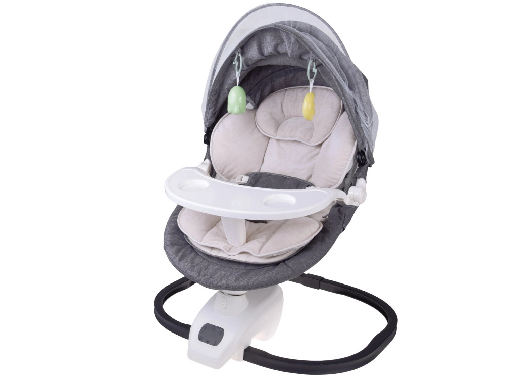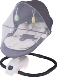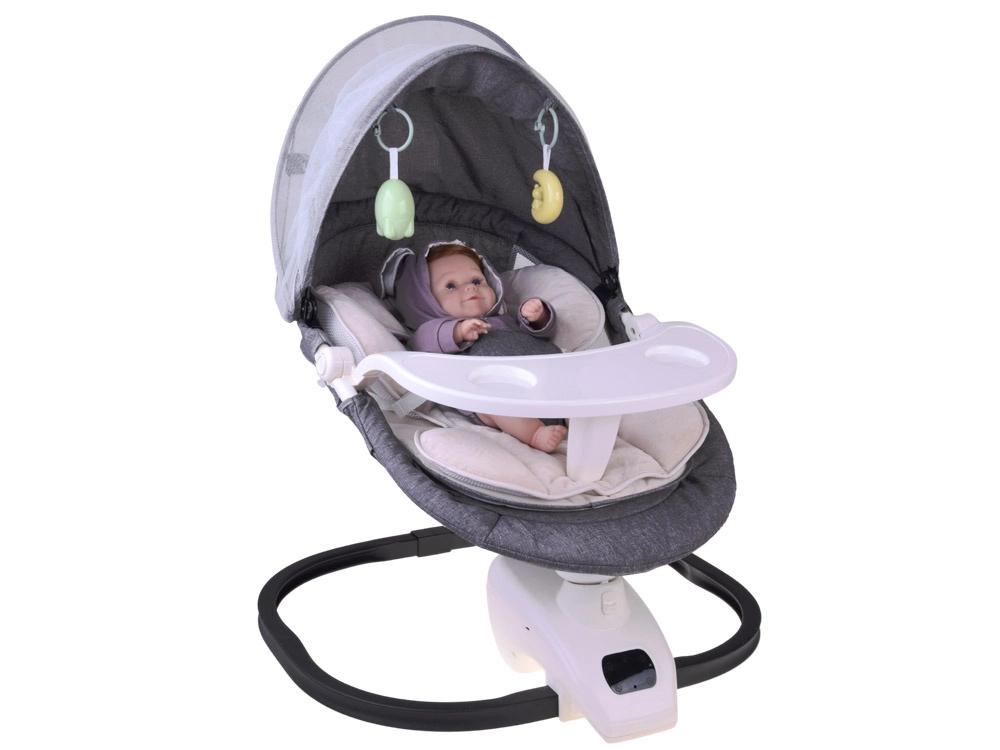 Das integrierte Musikpanel mit Fernbedienung ermöglicht die Einstellung der Schaukelintensität, der Lautstärke, das Umschalten der Wiegenlieder sowie die Nutzung des Timers (z. B. 8/15/30 Min). Das verstellbare Verdeck mit Spielzeugen spendet Schatten, das feine Moskitonetz schützt vor Insekten. Der Bezug lässt sich leicht abnehmen und waschen, die Konstruktion ist stabil und sicher.