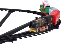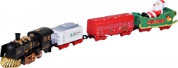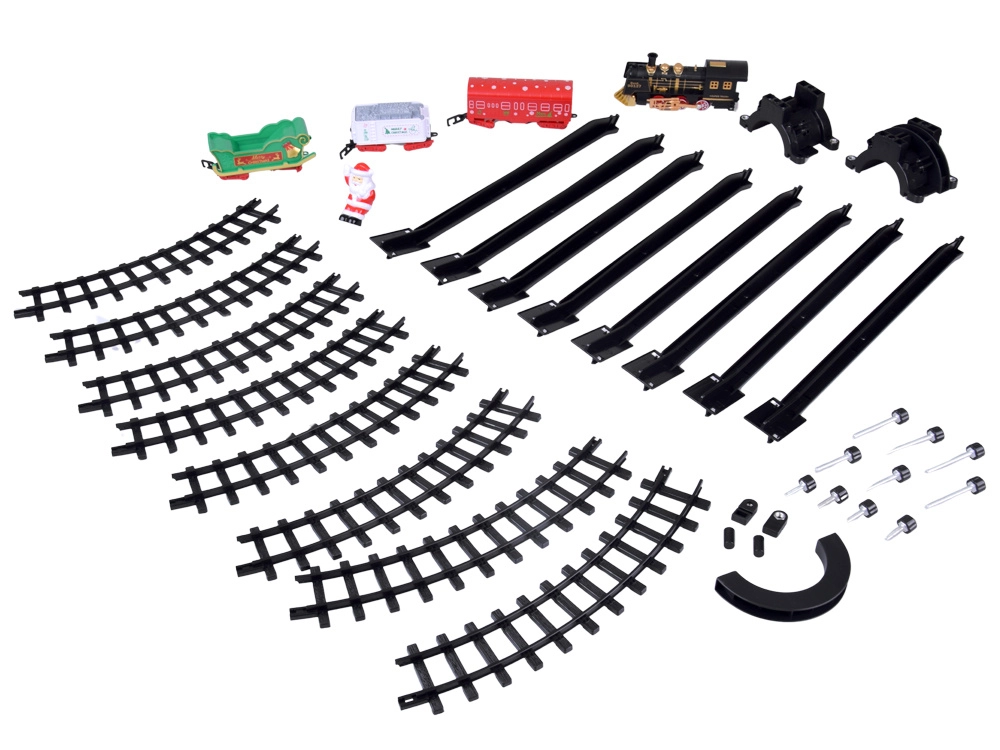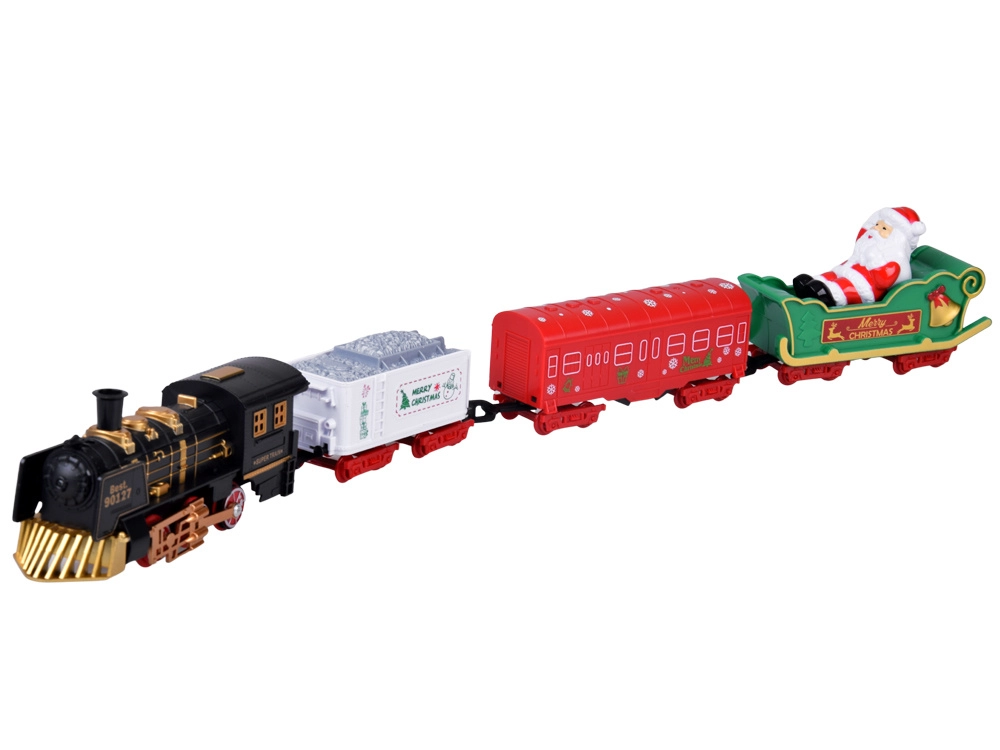 Das Set besteht aus einer schwarzen Lokomotive und drei verschiedenen Waggons: ein weißer Kohlewagen mit der Aufschrift Merry Christmas, ein roter Wagen mit Verzierungen und ein grüner Schlitten mit Santa.