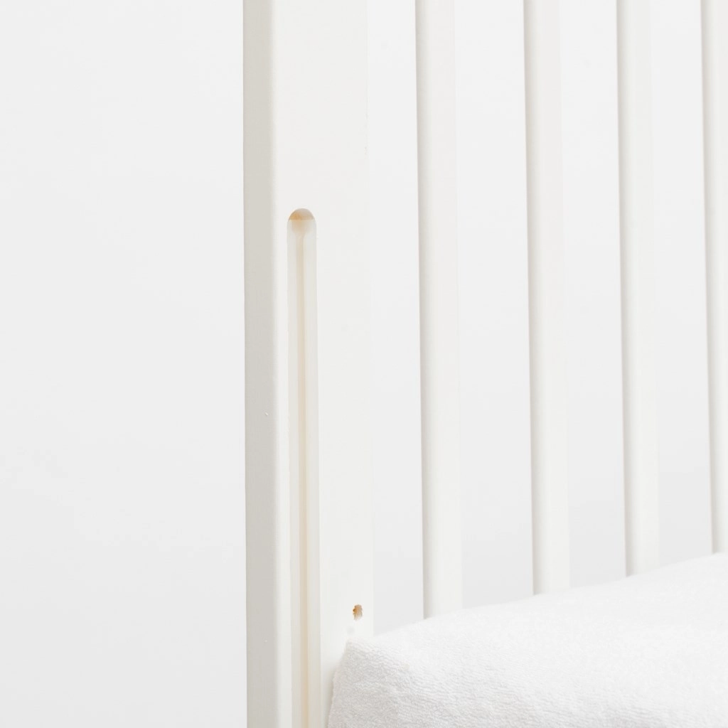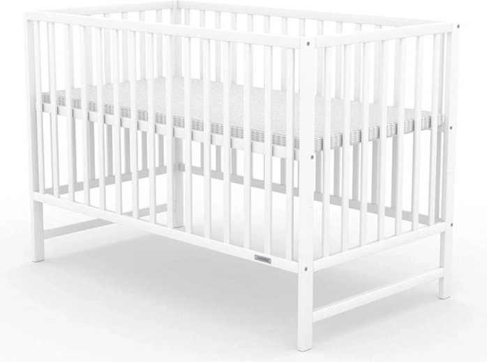 Das Bett NEW BABY BASIC in Weiß kombiniert modernes Design, durchdachte Sicherheitsdetails und Langlebigkeit. Der robuste Rahmen aus 100 % Kiefernholz mit flachen Sprossen und drei herausnehmbaren Leisten erleichtert den Zugang zum Kind und die Belüftung. Der in 3 Positionen verstellbare Lattenrost (22/38/51 cm) wächst mit Ihrem Baby mit.