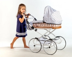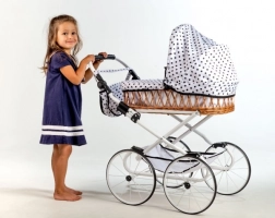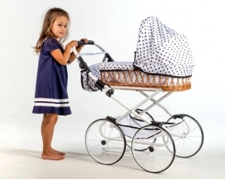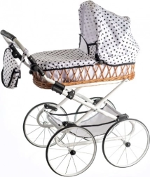 Schenken Sie Kindern den Zauber des klassischen Stils mit dem Retro-Kinderwagen Monika. Die Kombination aus Weidenkorb, weißem Gestell und verspieltem Punktmuster wirkt elegant und zeitlos. Der Kinderwagen ist leicht, stabil und durchdacht für bequemes tägliches Spielen.