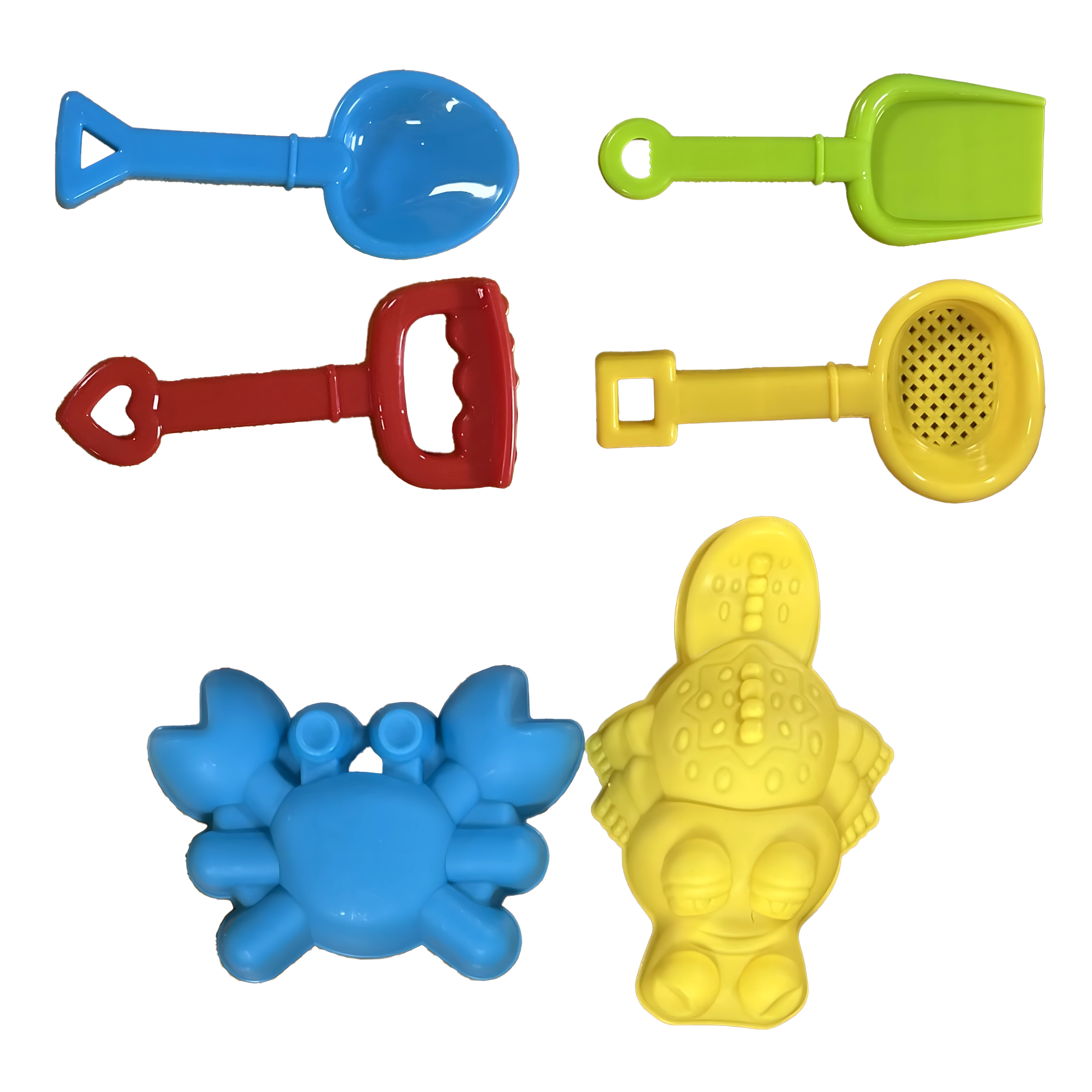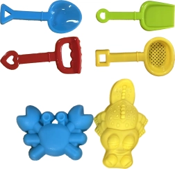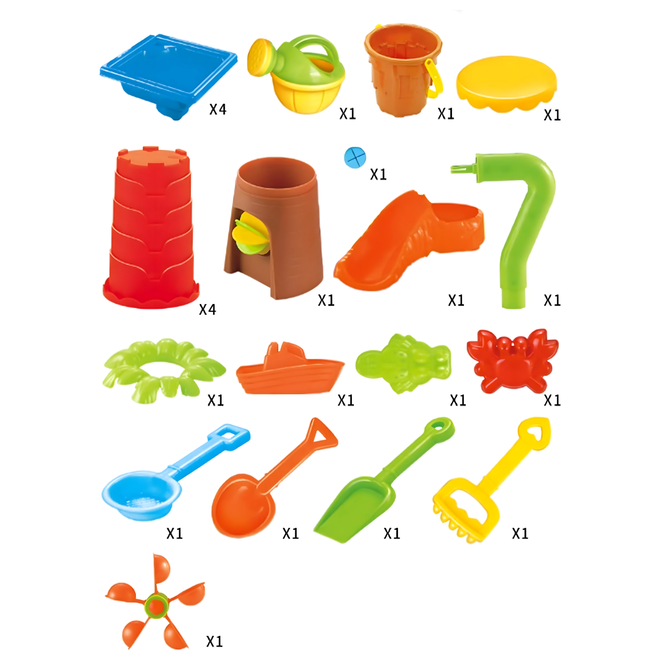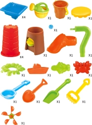 Gießkanne, Schaufeln, Harke, Sieb, Förmchen, Becher, Rutsche, Hocker, mehrkammeriger Tisch